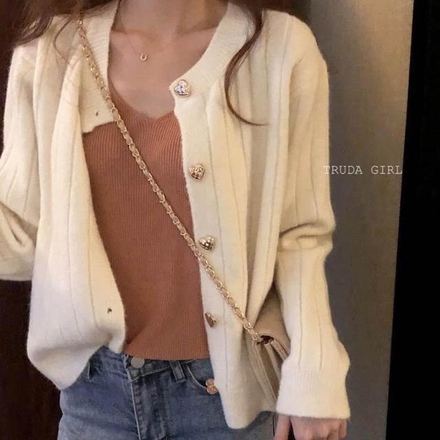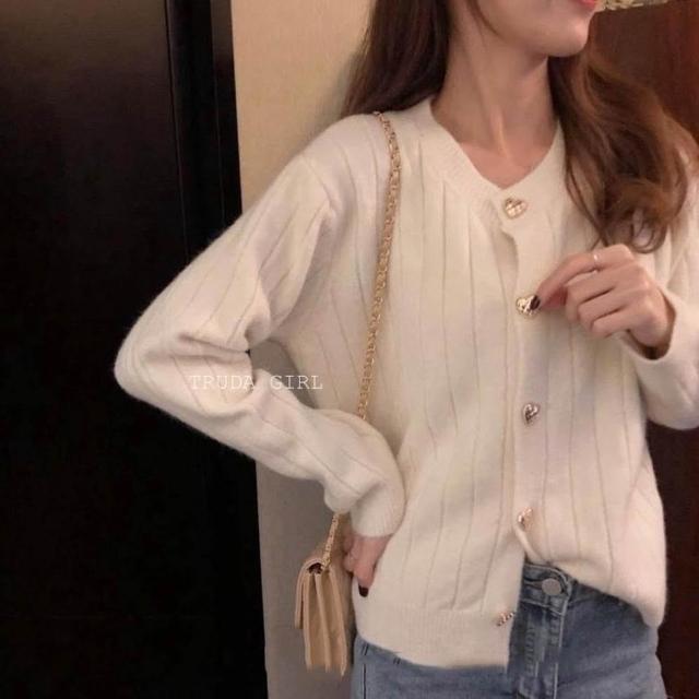 《杜達女孩》甜美愛心排釦坑條混仿羊絨針織毛衣 心型釦 針織外套 包心紗針織 針織衫 毛衣外套 長袖上衣 長袖毛衣