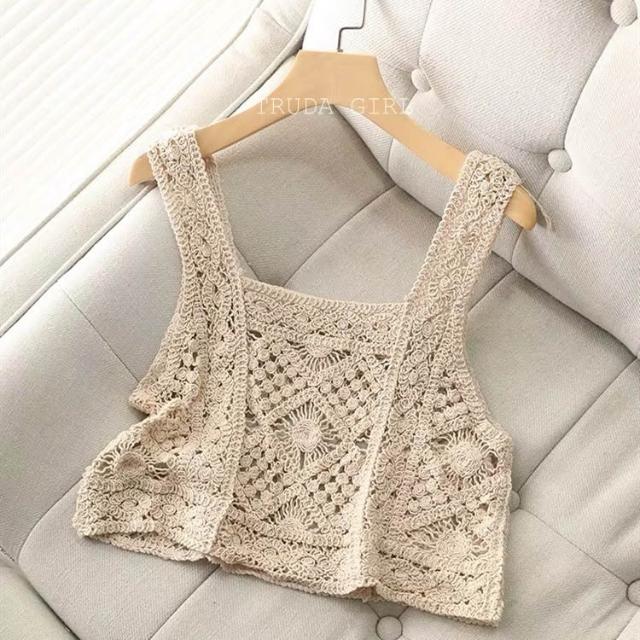 《杜達女孩》波西米亞蕾絲鏤空背心 鈎花針織吊帶背心 渡假風洞洞罩衫 渡假海邊 蕾絲上衣 寬鬆背心 短版 女