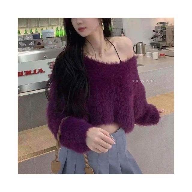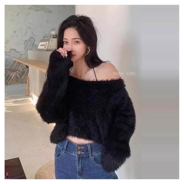 《杜達女孩》小奶貓手感仿水貂絨上衣 一字領上衣 絨毛上衣 毛茸茸上衣 長袖上衣 毛毛上衣 秋冬針織 短版毛衣 V領毛衣