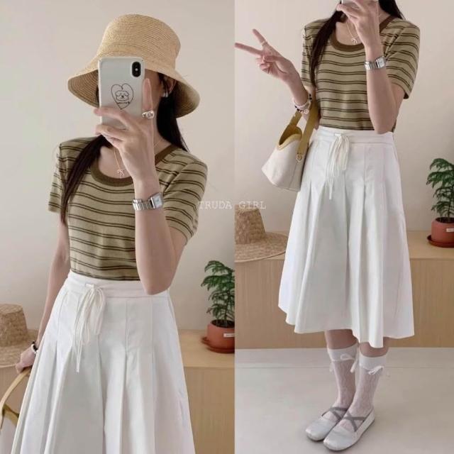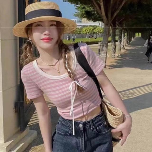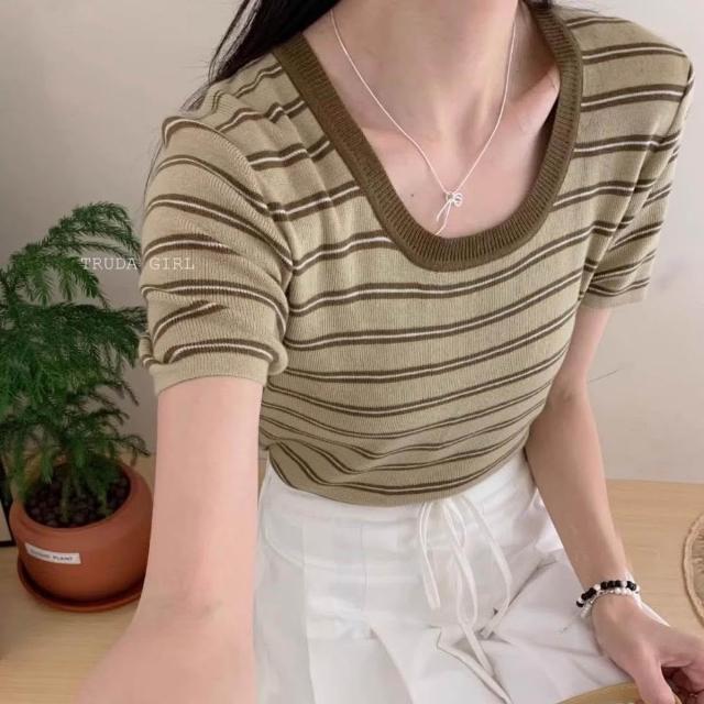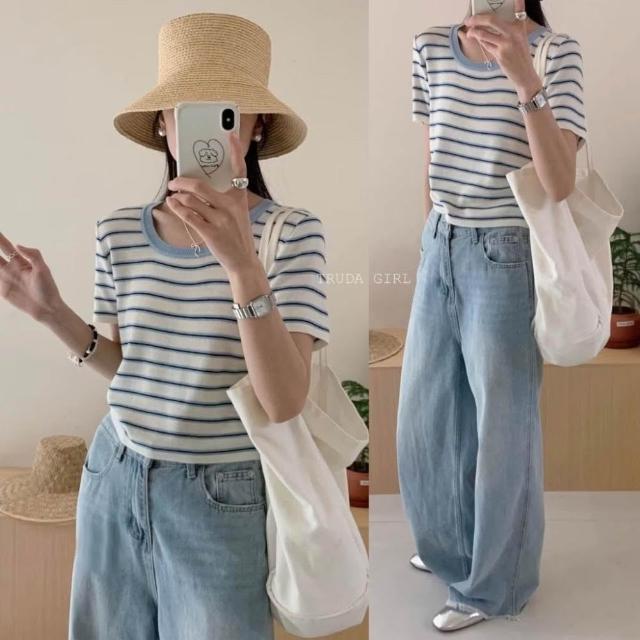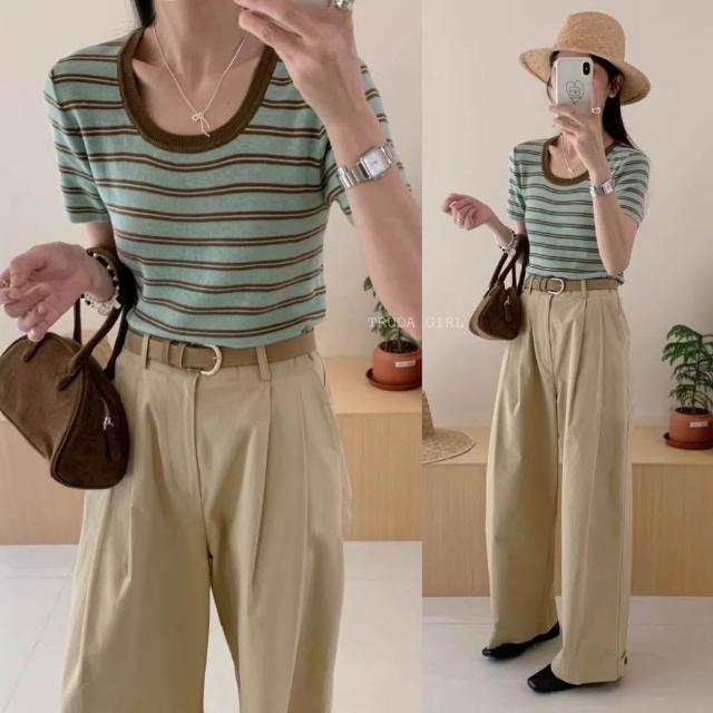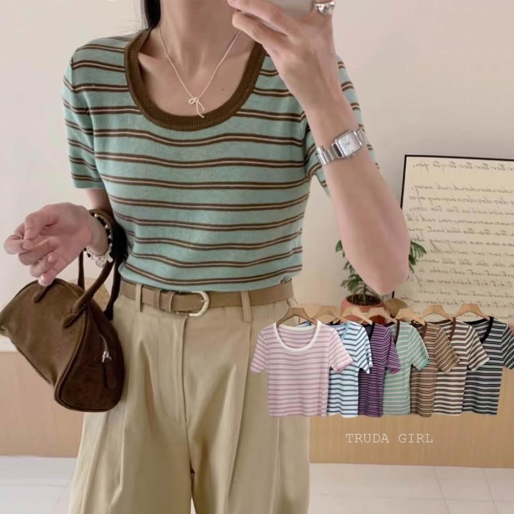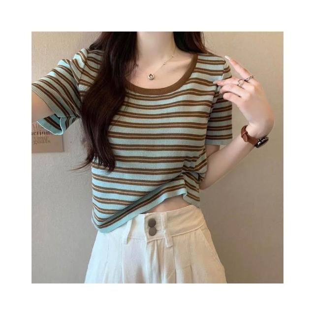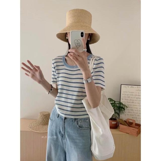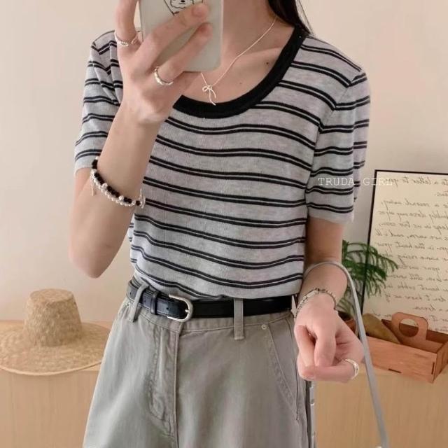 《杜達女孩》自留推薦 薄冰絲條紋針織上衣 領口滾邊撞色條紋上衣 短袖上衣 薄針織 短版上衣 寬鬆上衣 短袖針織 冰絲針織