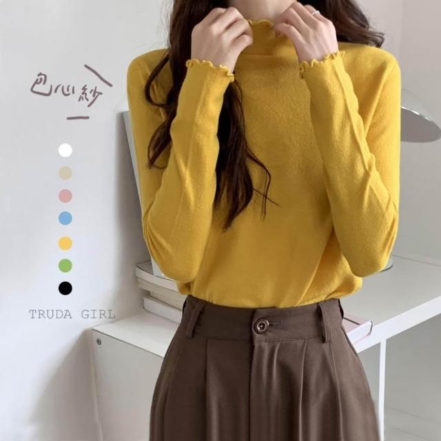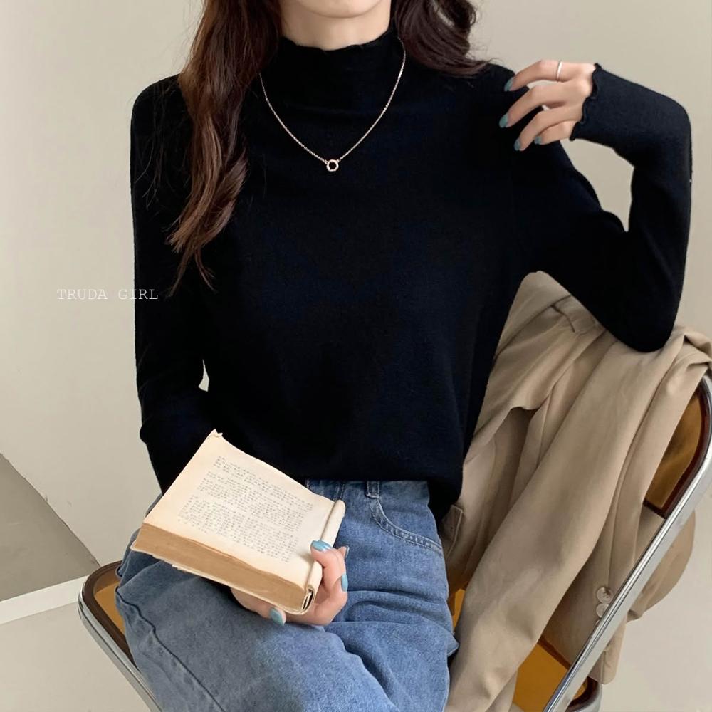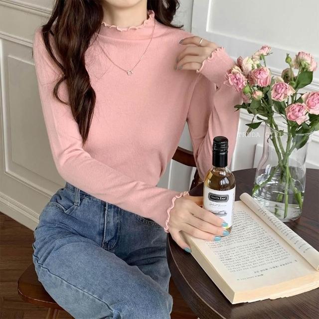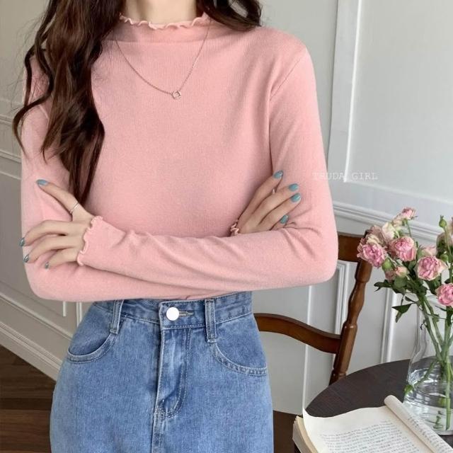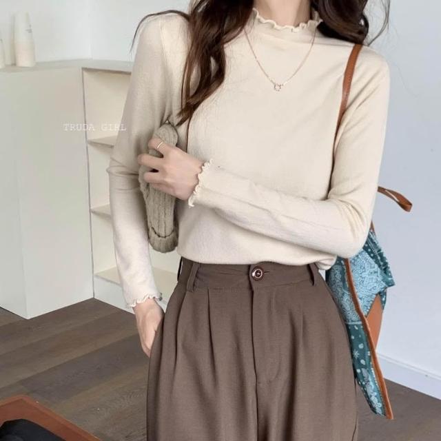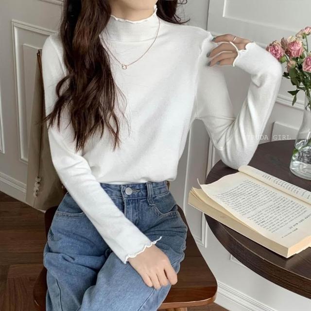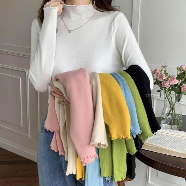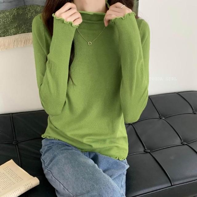 《杜達女孩》穿搭公式 捲邊包心紗半高領 花邊高領針織上衣 包心紗卷卷邊波浪邊木耳邊半高領 針織內搭 針織上衣 長袖薄針織