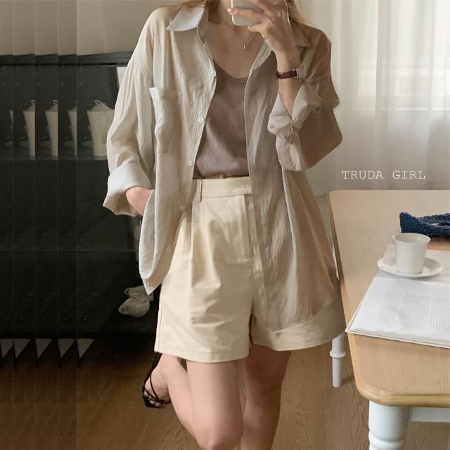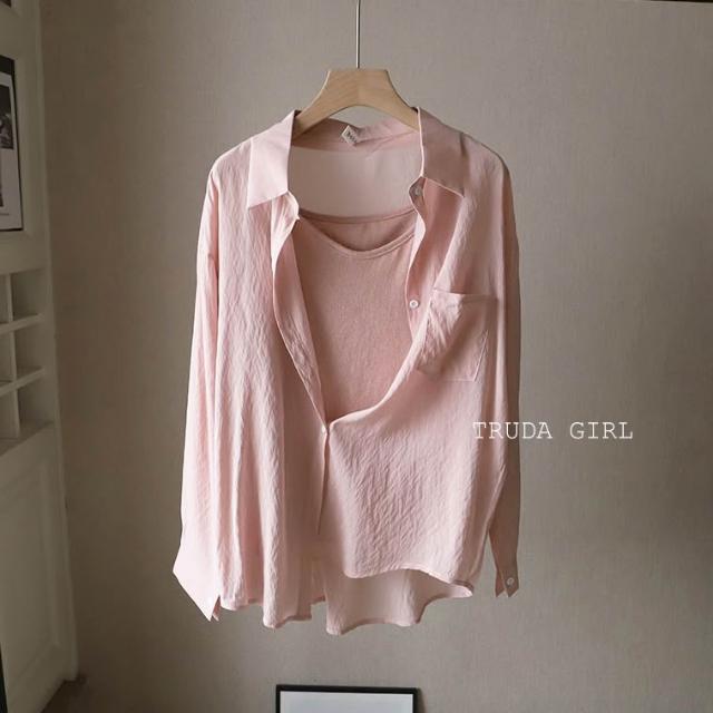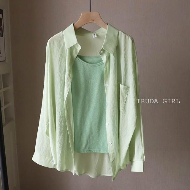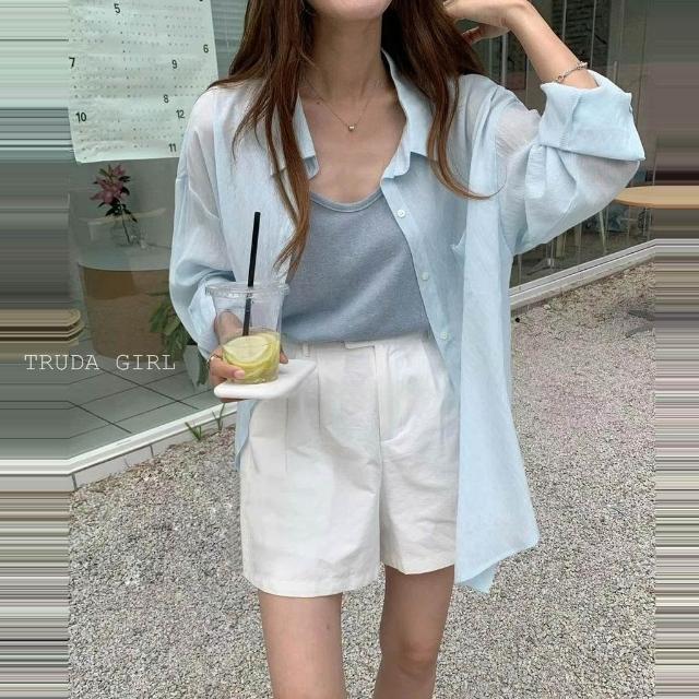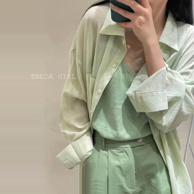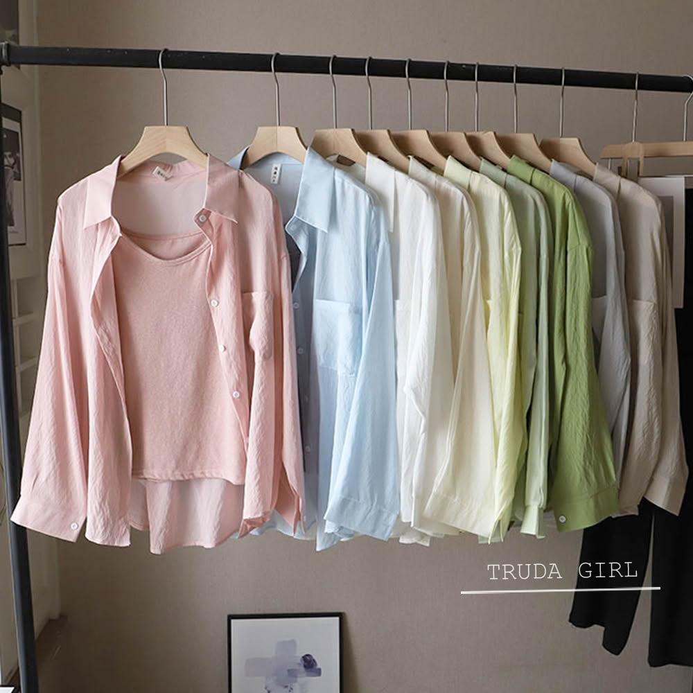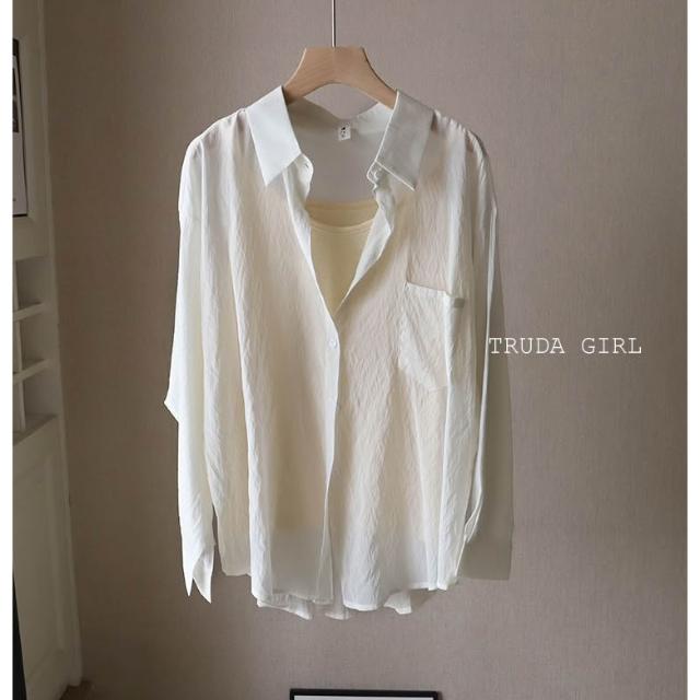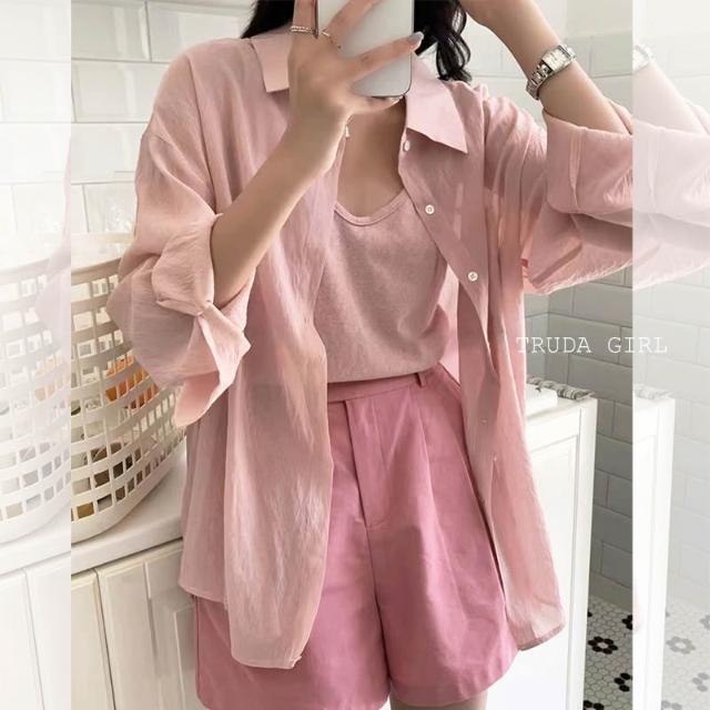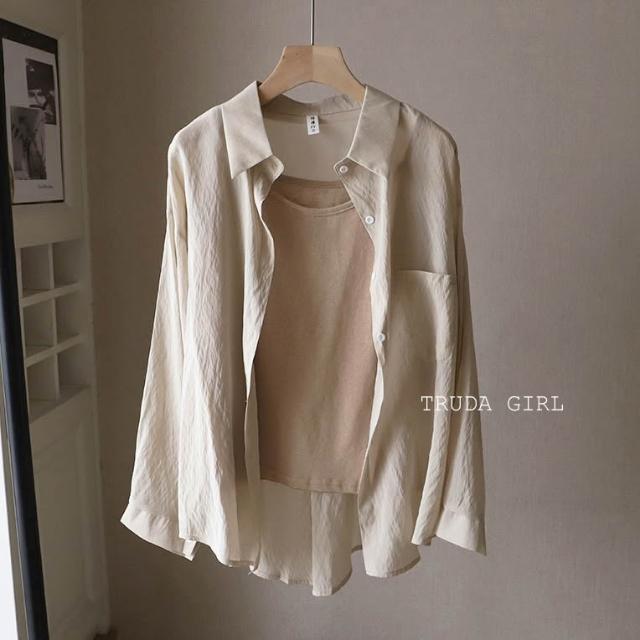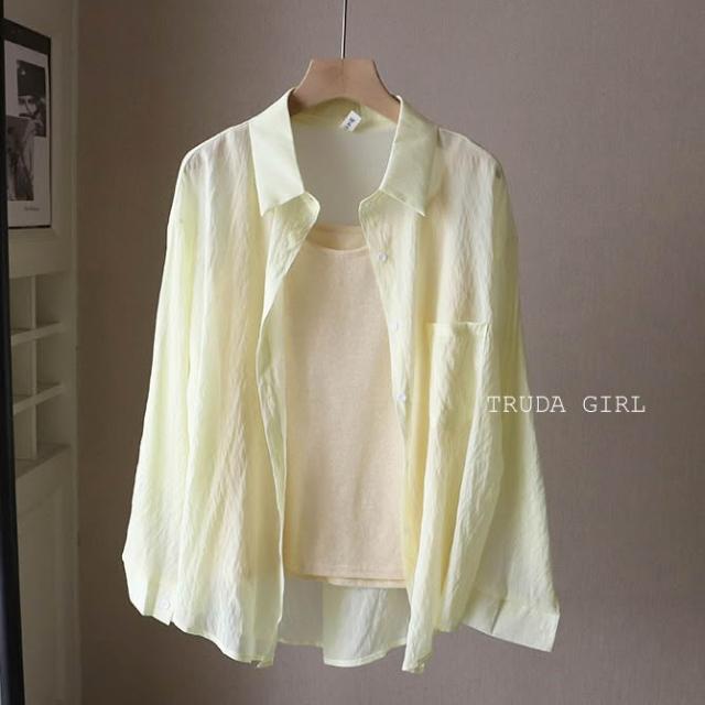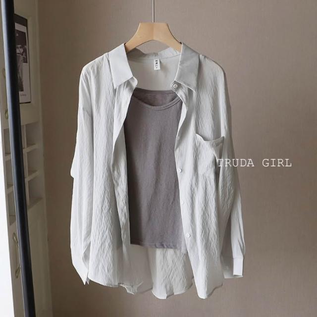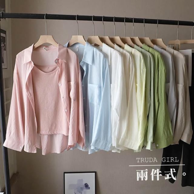 《杜達女孩》夏日微透輕麻兩件套 襯衫+吊帶背心 防曬罩衫 小可愛 兩件式 雪紡罩衫 開衫外套 薄款 防曬外套 襯衫 罩衫