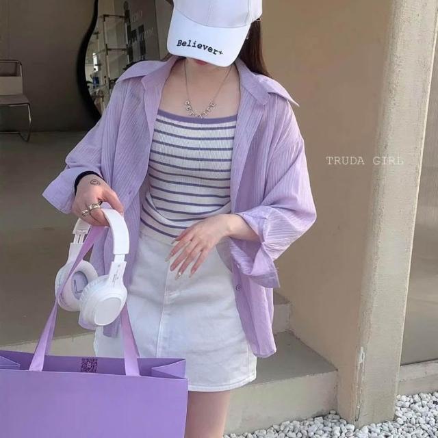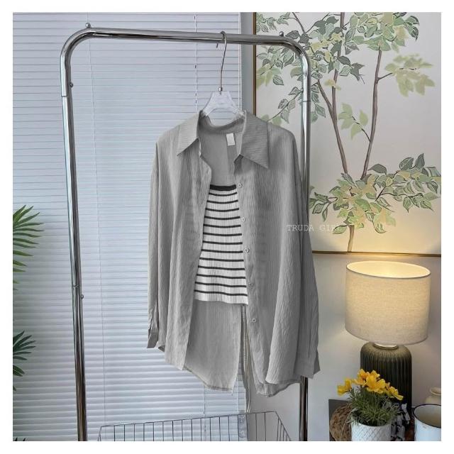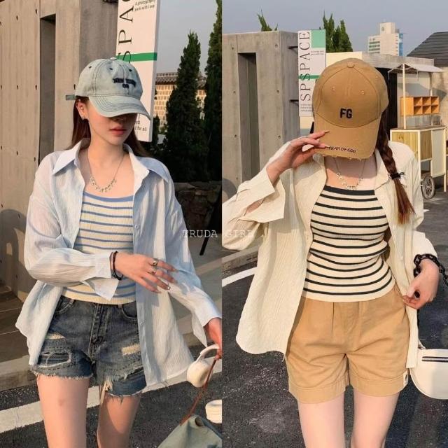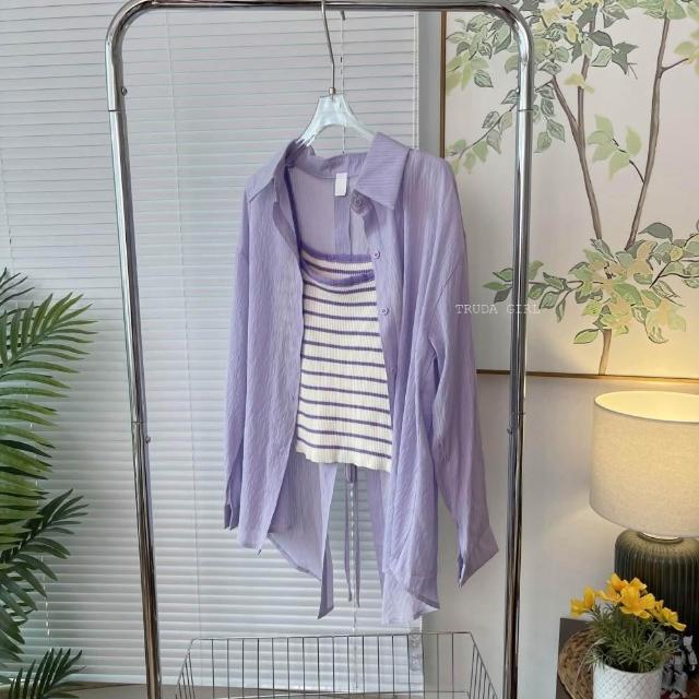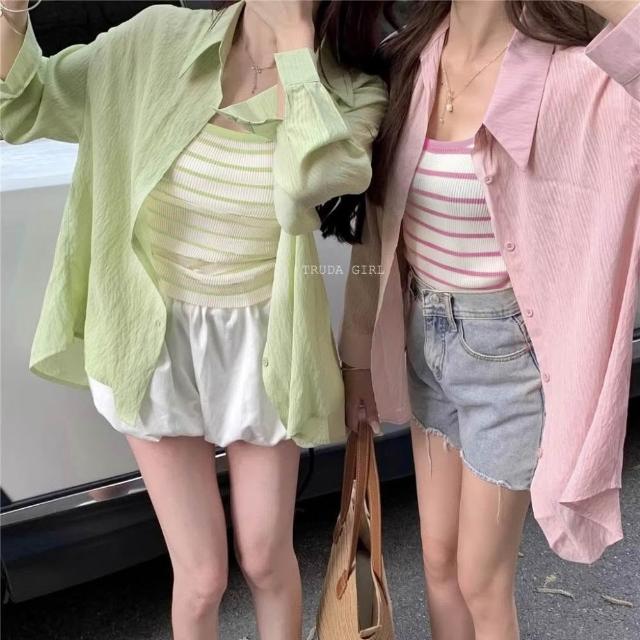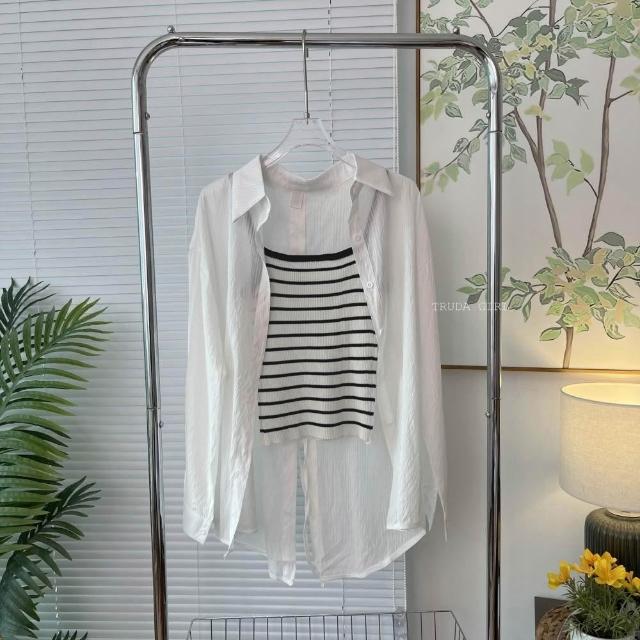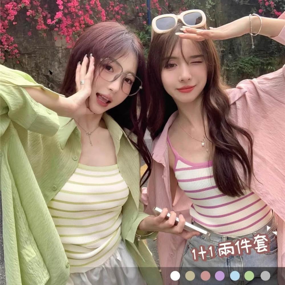 《杜達女孩》條紋款1+1襯衫兩件套 襯衫+針織吊帶背心 防曬罩衫 兩件式 雪紡罩衫 罩衫襯衫 薄款 防曬外套 襯衫 罩衫