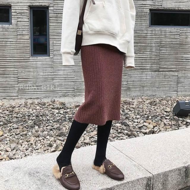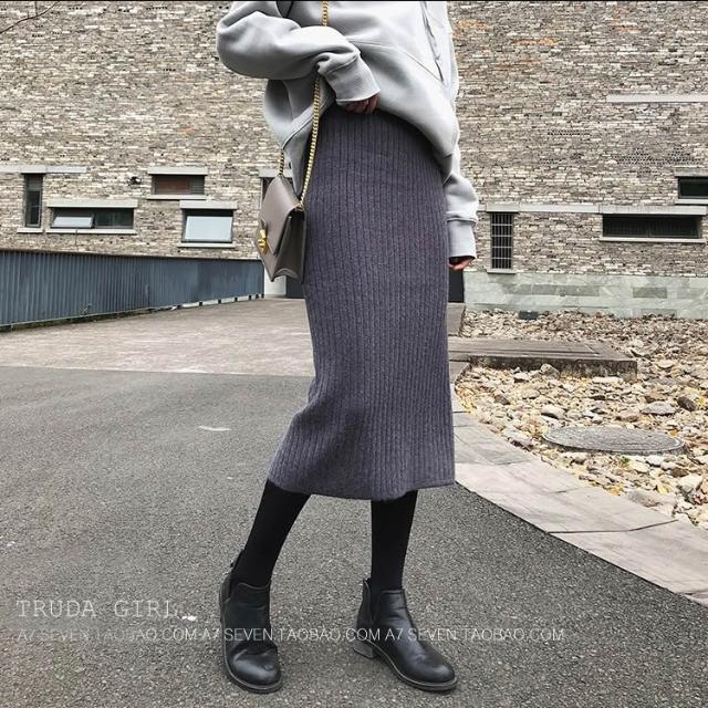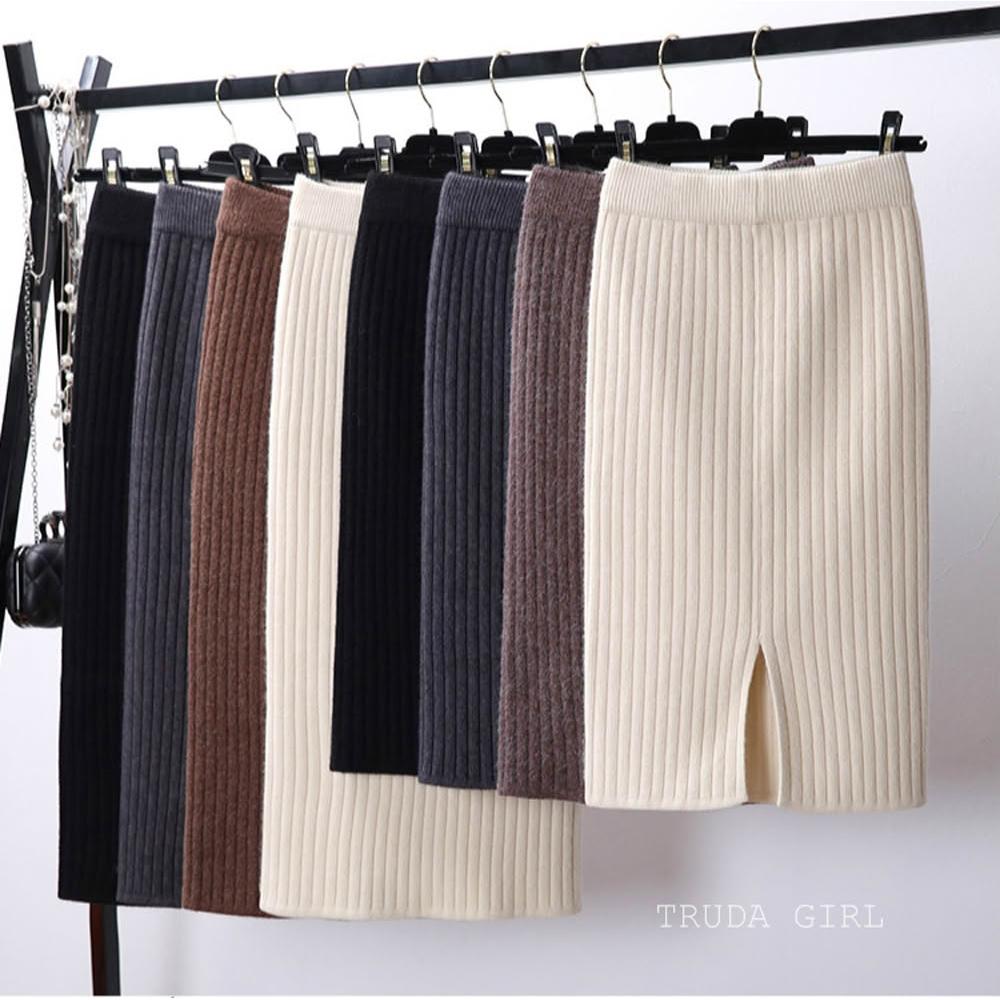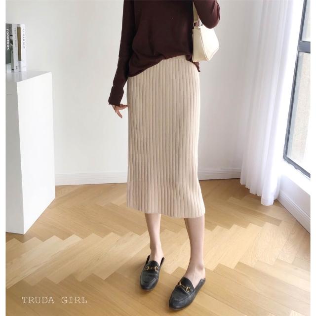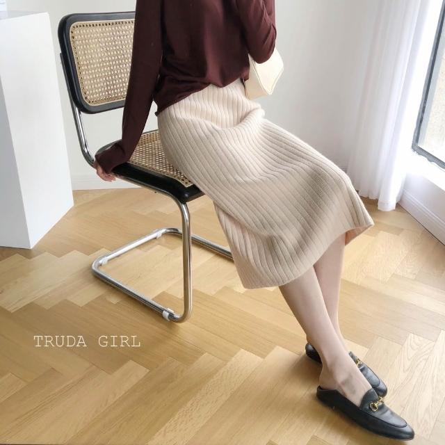 《杜達女孩》加厚仿羊絨混紡開叉針織裙 兩種長度 包心紗 坑條螺紋半身裙 長裙 裙子 針織裙 針織長裙 及膝裙