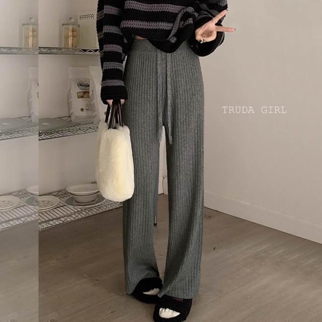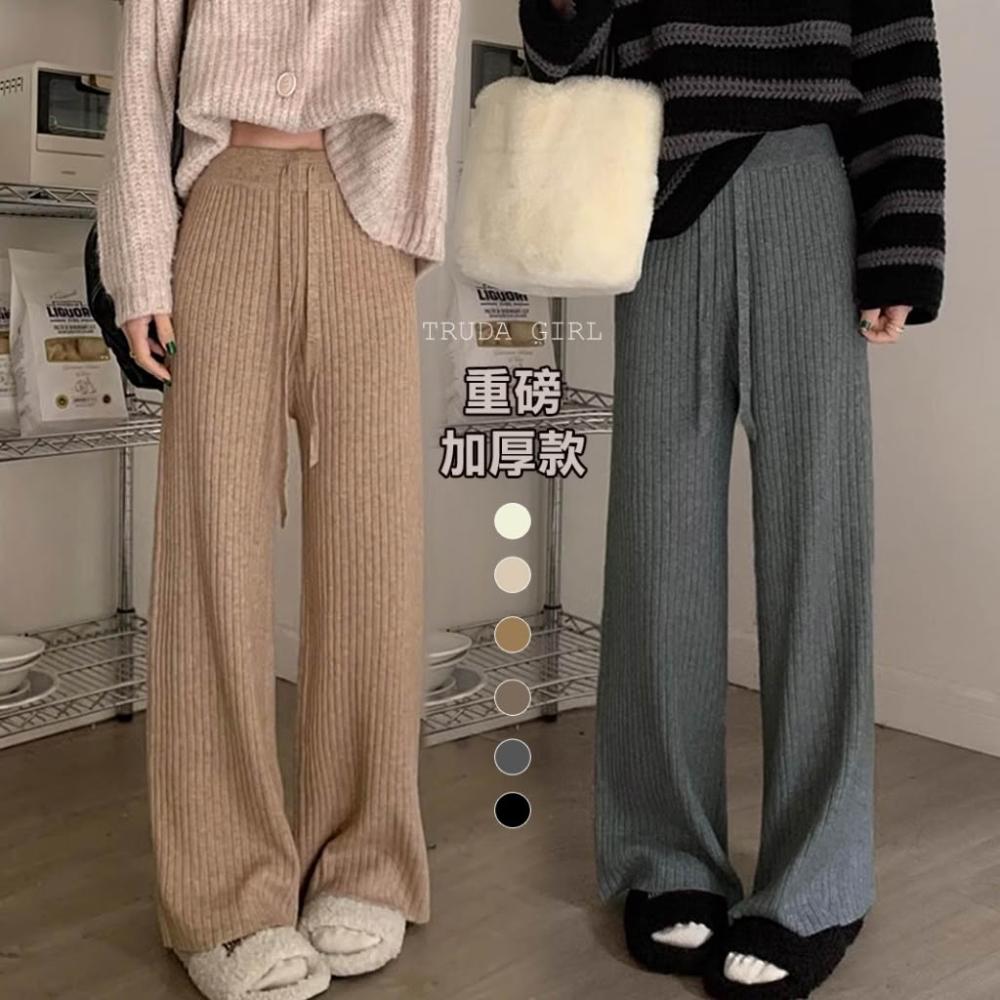 《杜達女孩》坑條款重磅加厚秋冬針織長褲 加厚包心紗針織闊腿褲 針織長褲 針織寬褲 鬆緊腰直筒褲 針織褲 保暖長褲 女長褲