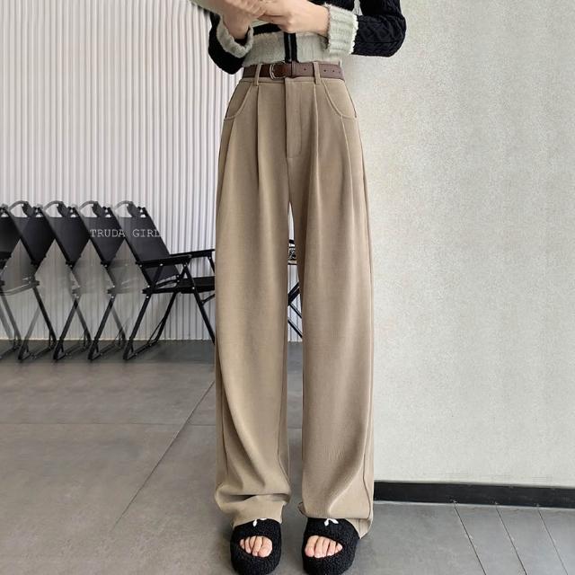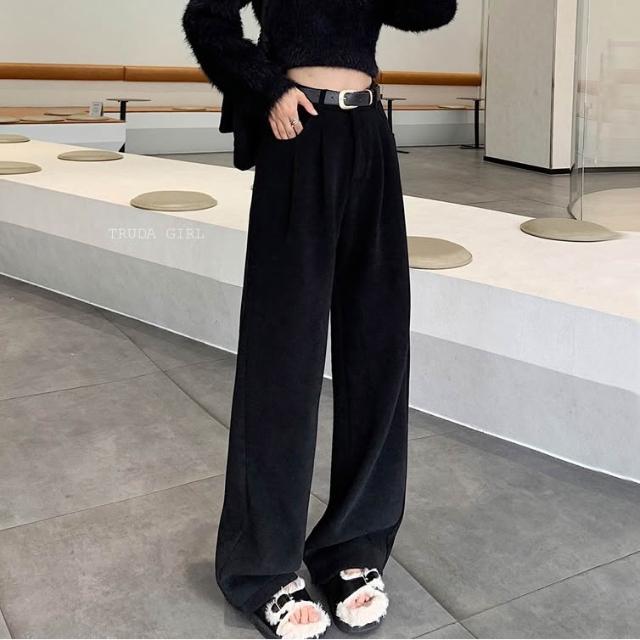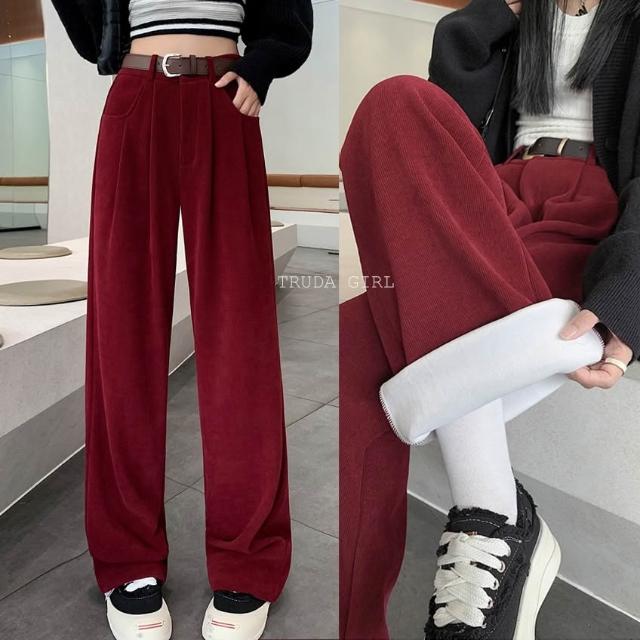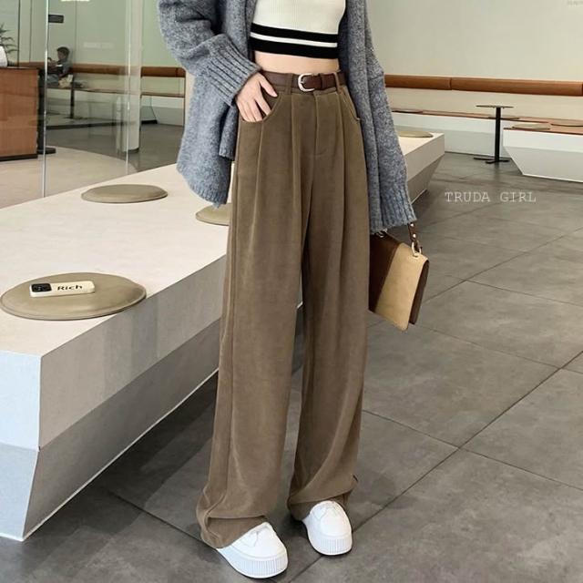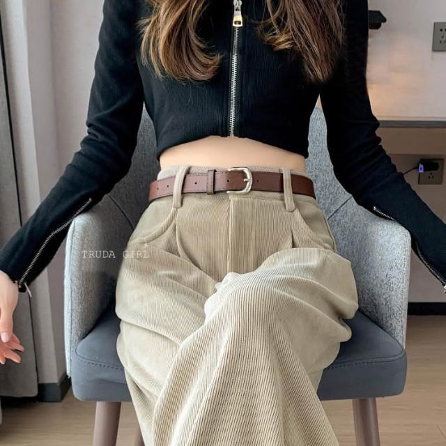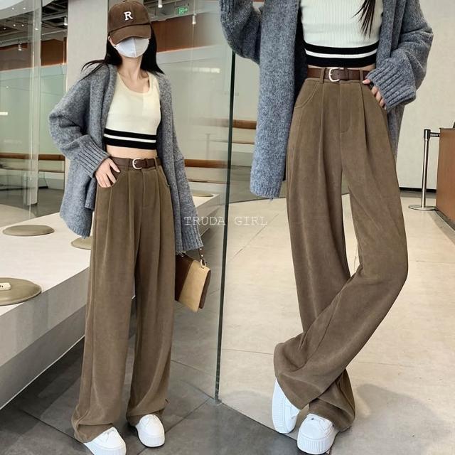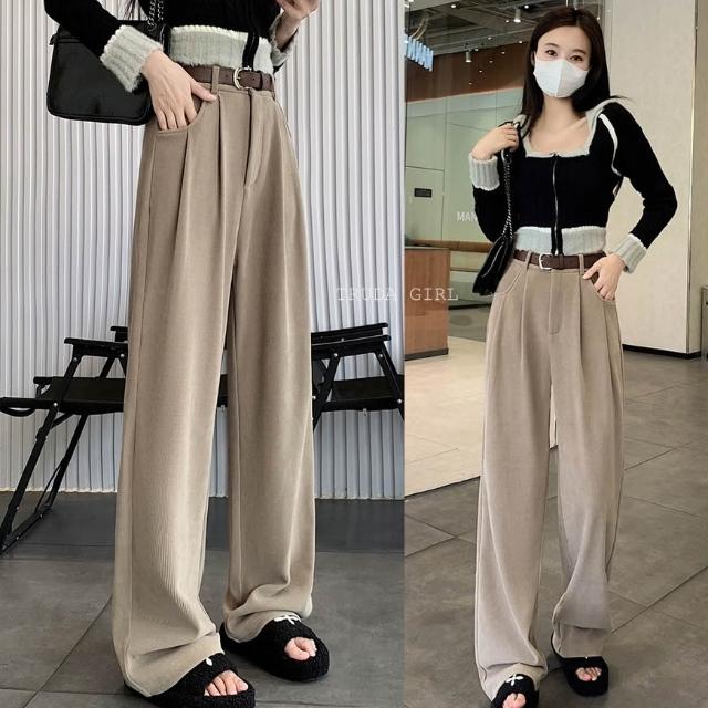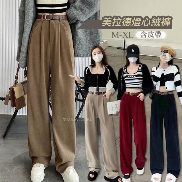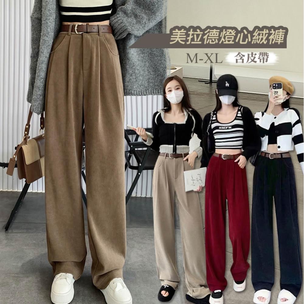 《杜達女孩》含皮帶 美拉德加絨燈心絨長褲 加厚燈芯絨闊腿褲 雪尼爾長褲 寬褲 坑條長褲 休閒褲 西裝長褲 鬆緊腰保暖褲子