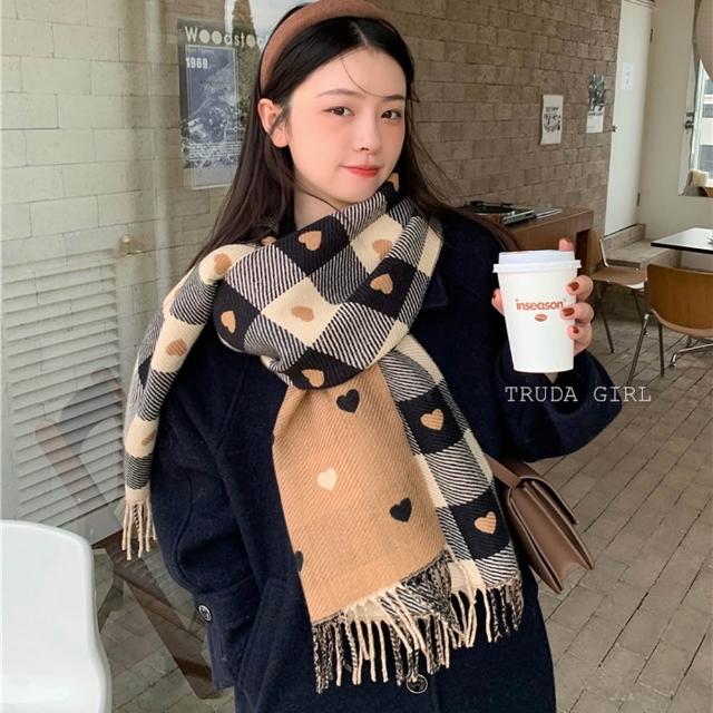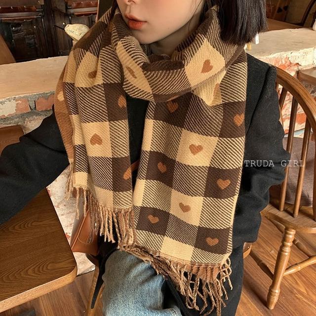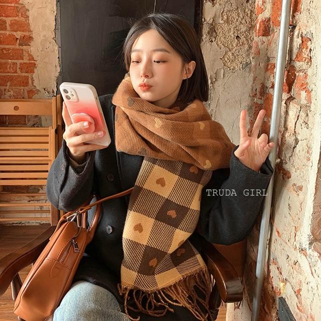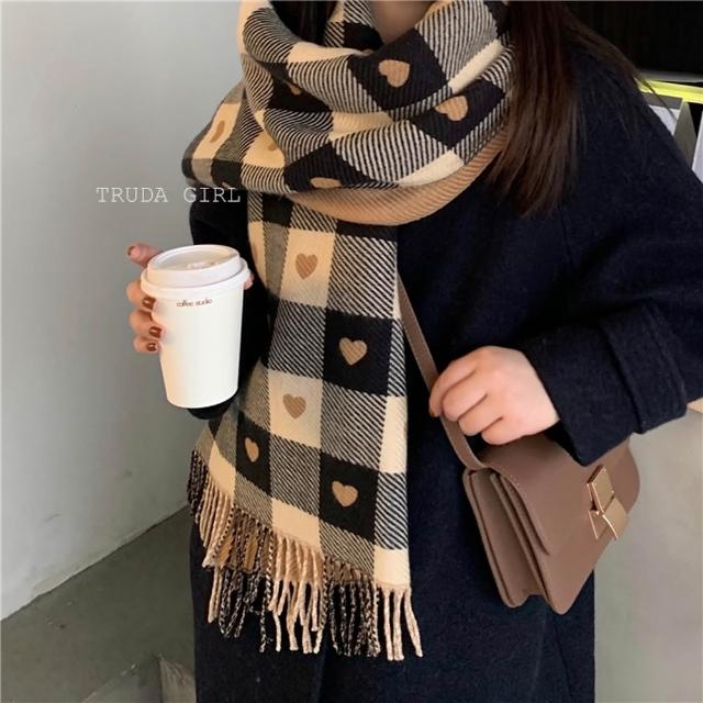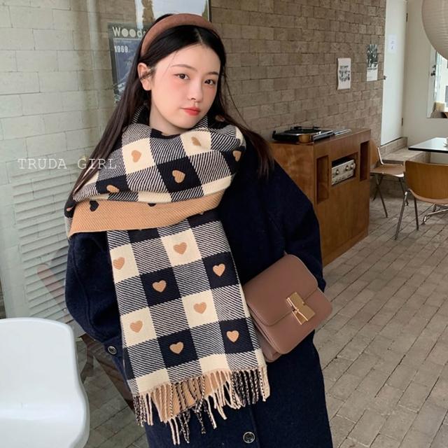 《杜達女孩》高質感超柔棋盤格愛心雙面仿羊絨圍巾披肩 愛心方塊格子 雙面圍巾 流蘇格子圍巾 披肩 格紋圍巾 圍巾