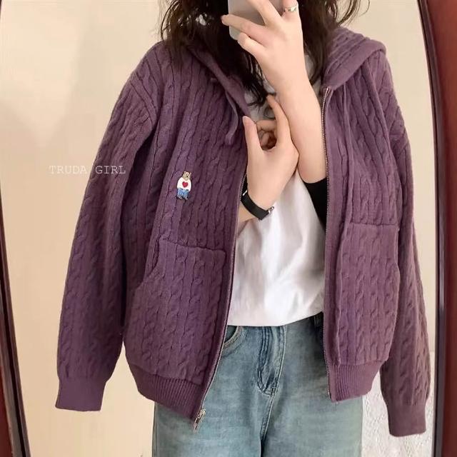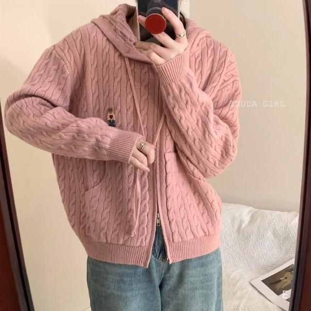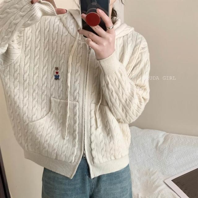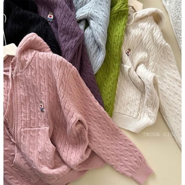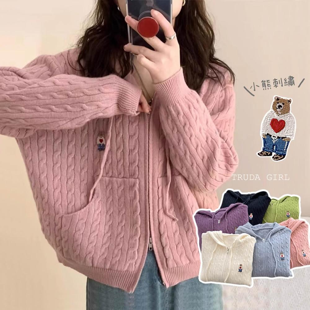 《杜達女孩》學院小熊刺繡麻花連帽針織外套 雙拉鍊麻花外套 連帽針織外套 連帽外套 寬鬆外套 厚外套 毛衣外套 連帽針織