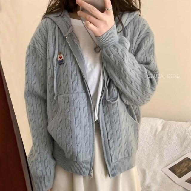 《杜達女孩》學院小熊刺繡麻花連帽針織外套 雙拉鍊麻花外套 連帽針織外套 連帽外套 寬鬆外套 厚外套 毛衣外套 連帽針織