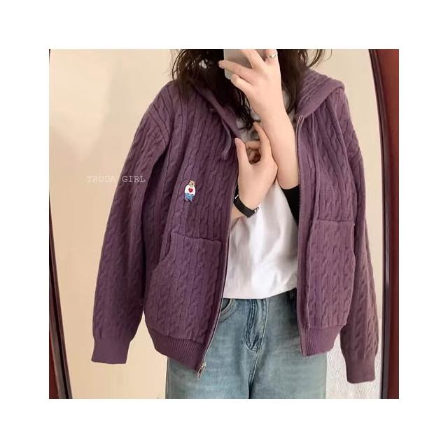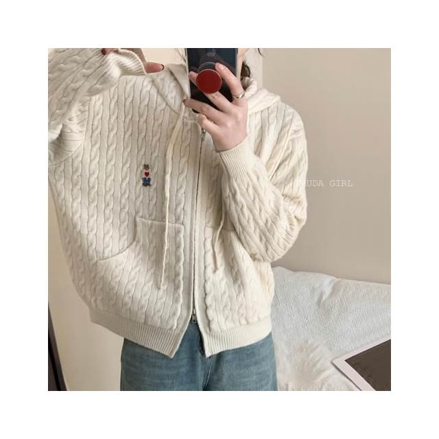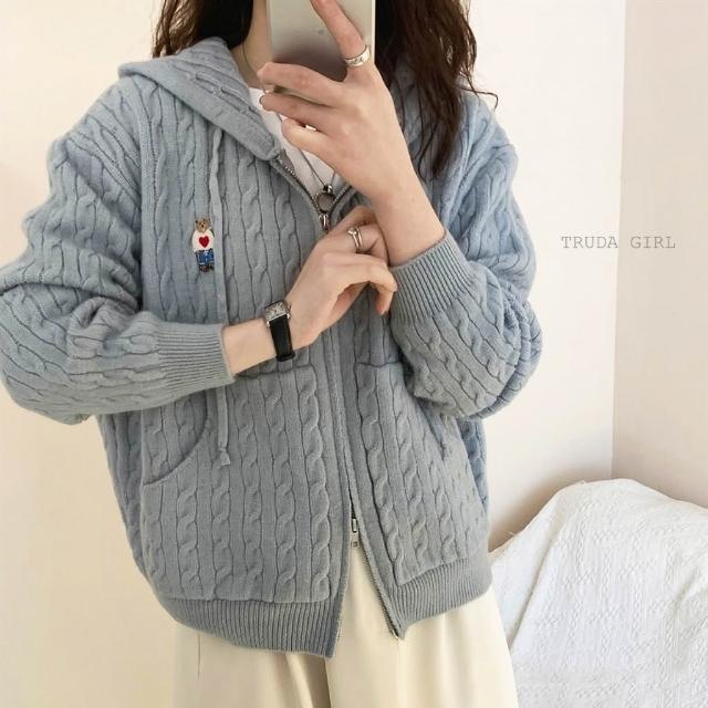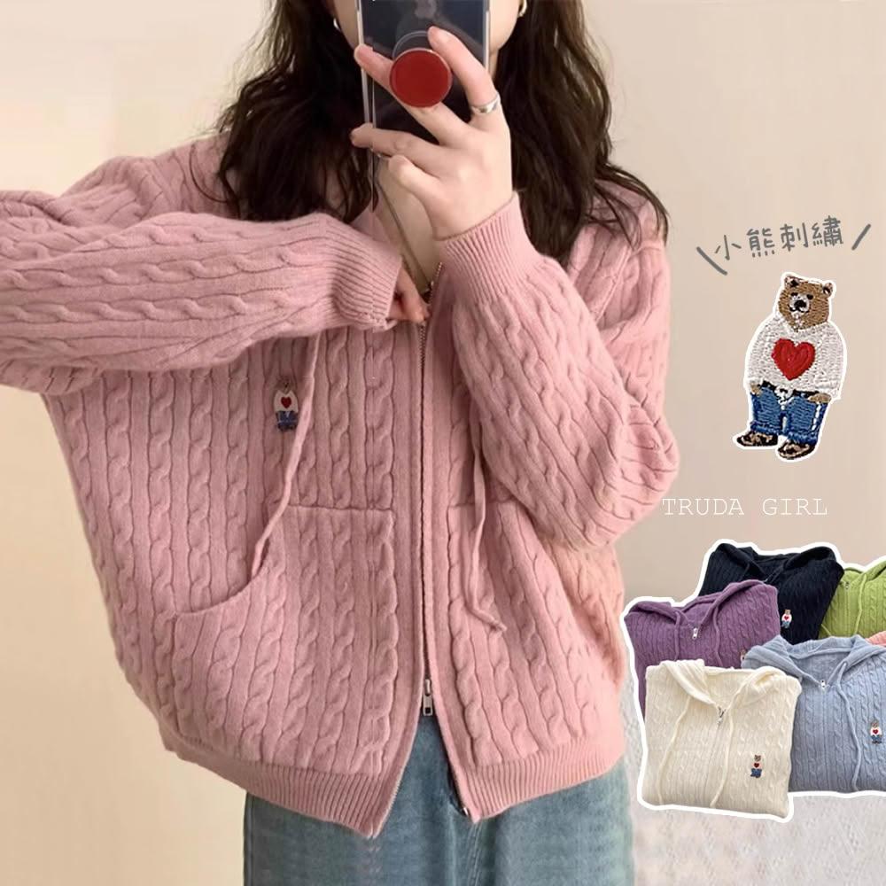 《杜達女孩》學院小熊刺繡麻花連帽針織外套 雙拉鍊麻花外套 連帽針織外套 連帽外套 寬鬆外套 厚外套 毛衣外套 連帽針織