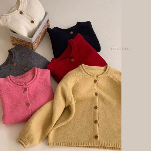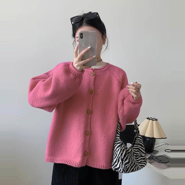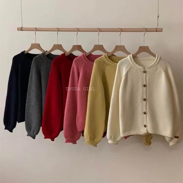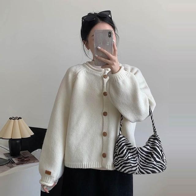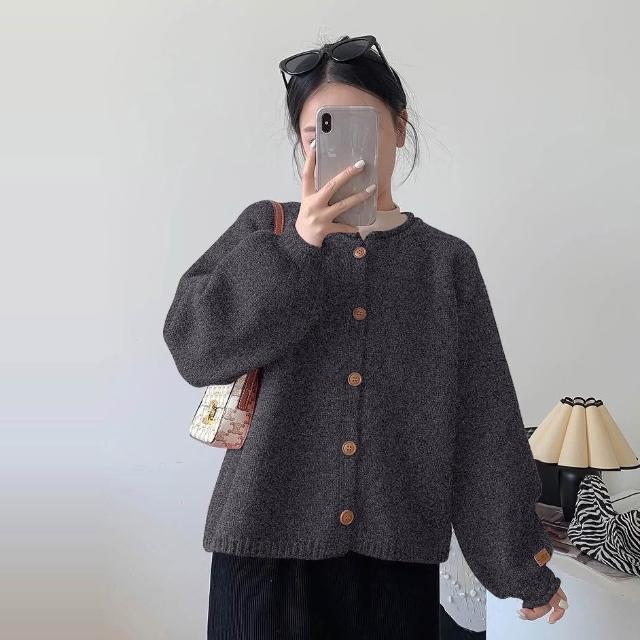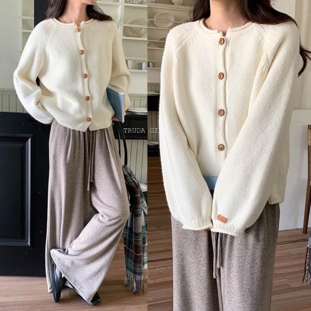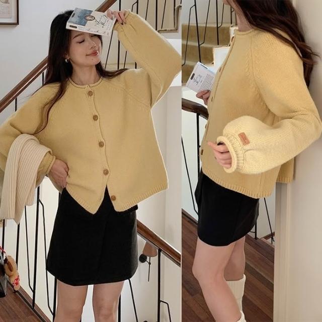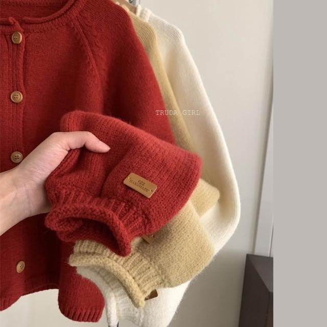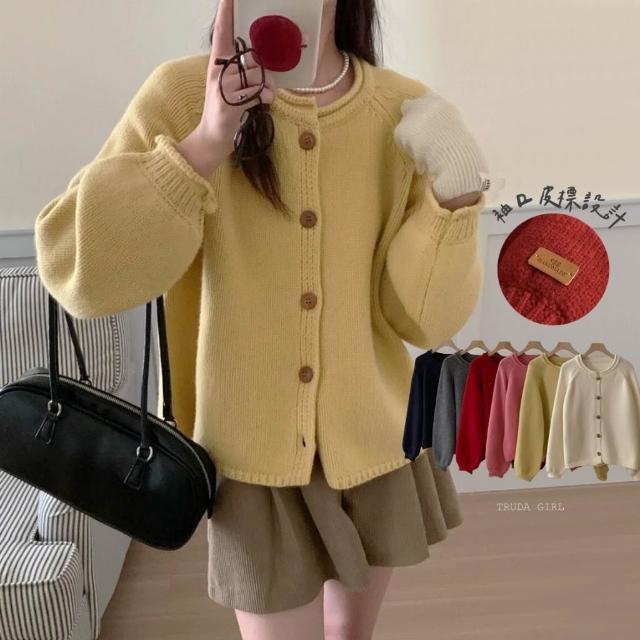 《杜達女孩》甜芝士皮標木質扣針織外套 高訂版花苞袖羊絨混紡捲邊針織外套 厚毛衣外套 保暖針織外套 秋冬針織外套 包芯紗女