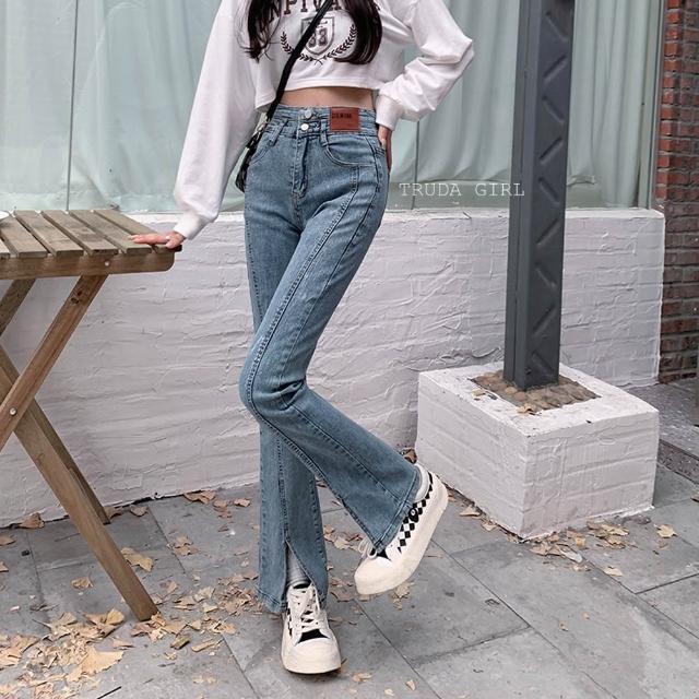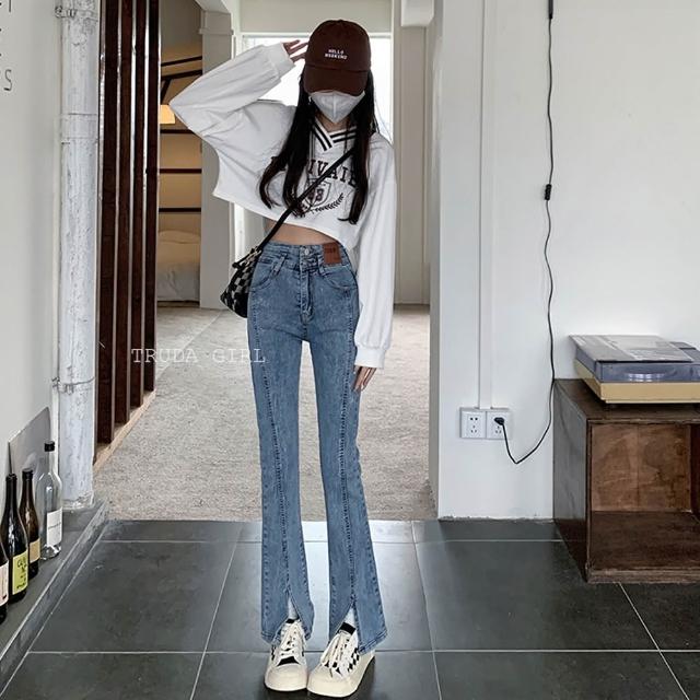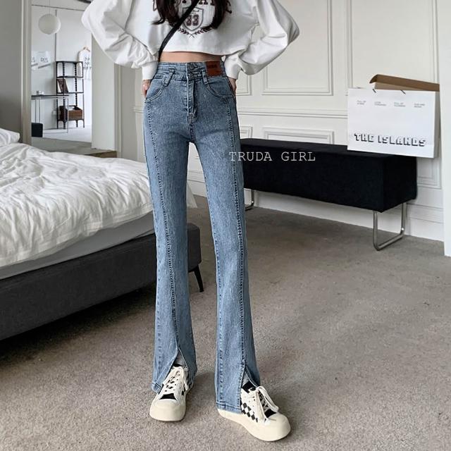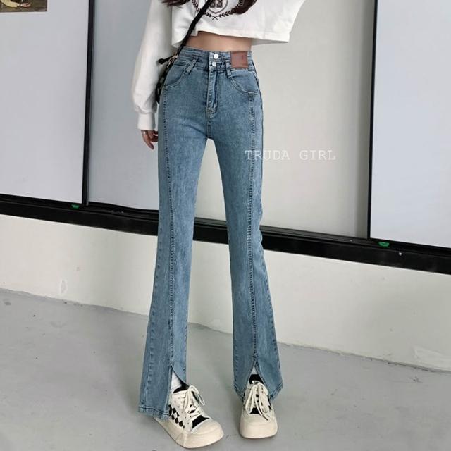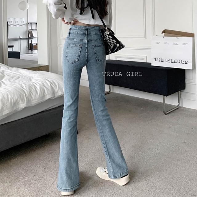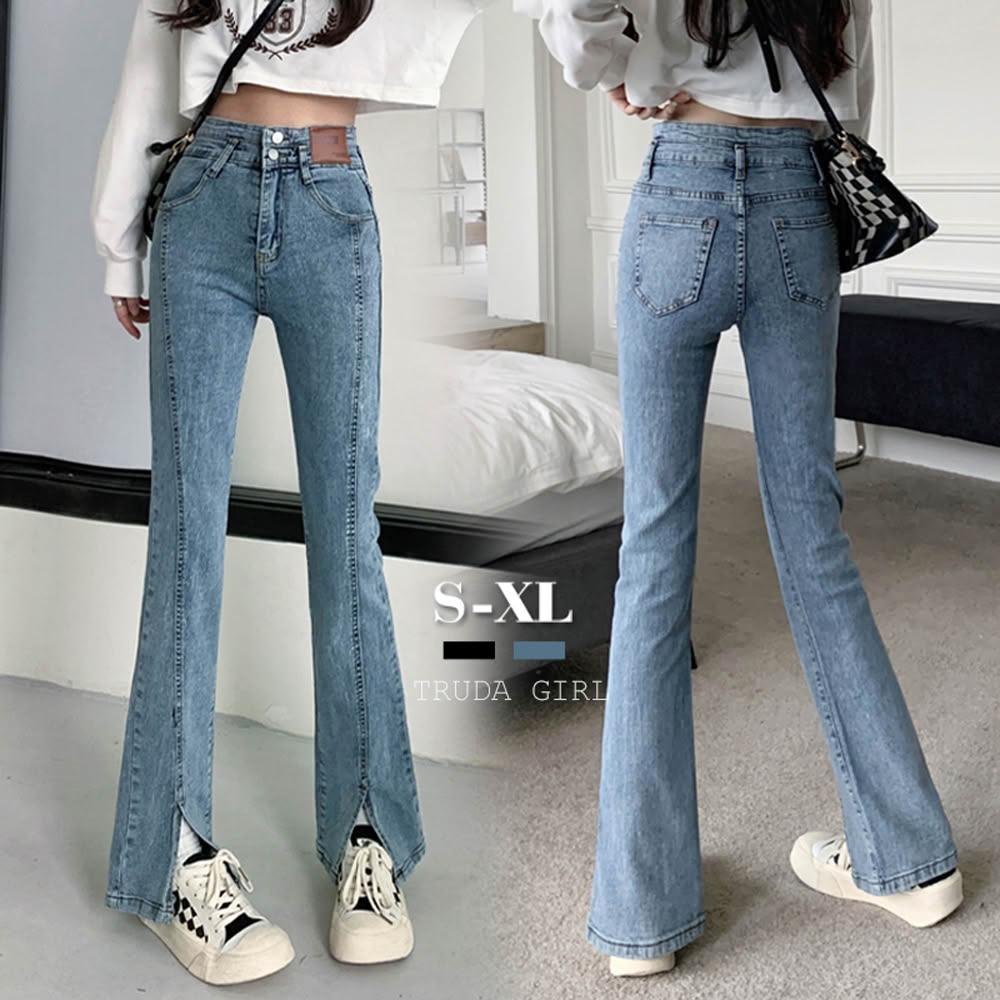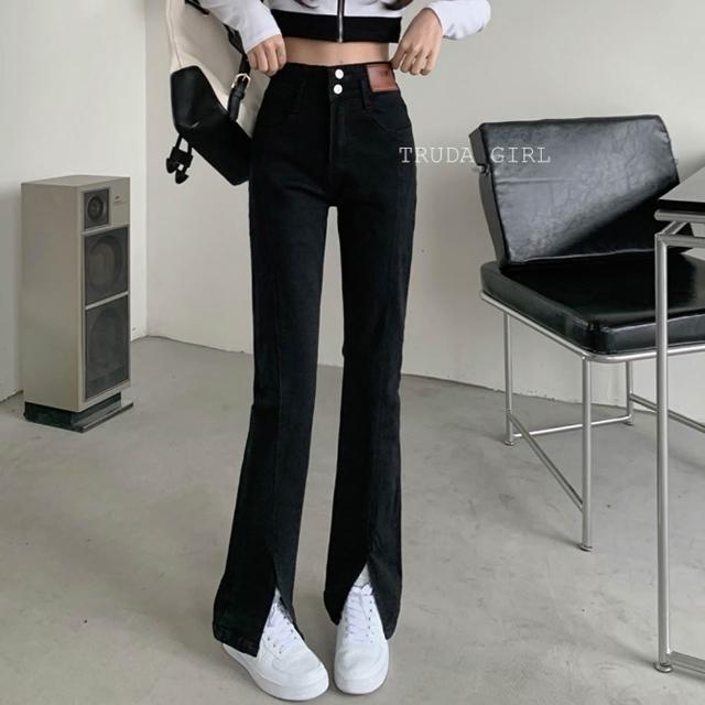 《杜達女孩》叫我長腿姊姊 高腰排扣微喇叭開叉牛仔長褲 高腰牛仔長褲 開叉牛仔褲 喇叭褲 牛仔褲 長褲 顯瘦 女
