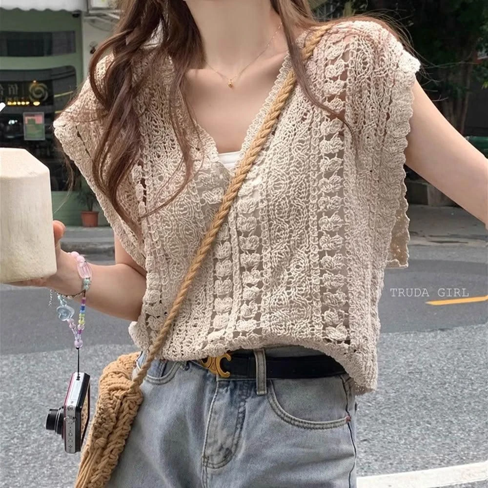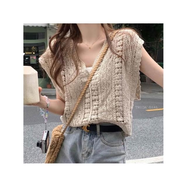 《杜達女孩》盛夏甜美針織鏤空上衣 夏季鈎花鏤空針織上衣 背心上衣 波西米亞海邊渡假風上衣 雕花蕾絲上衣 寬鬆無袖上衣 女