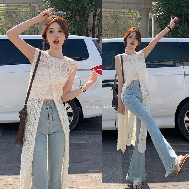 《杜達女孩》正反兩穿超韓ins極簡鏤空長版罩衫 針織繡花外搭罩衫 長版背心 開叉外搭背心 長版針織背心 疊穿連身裙 女