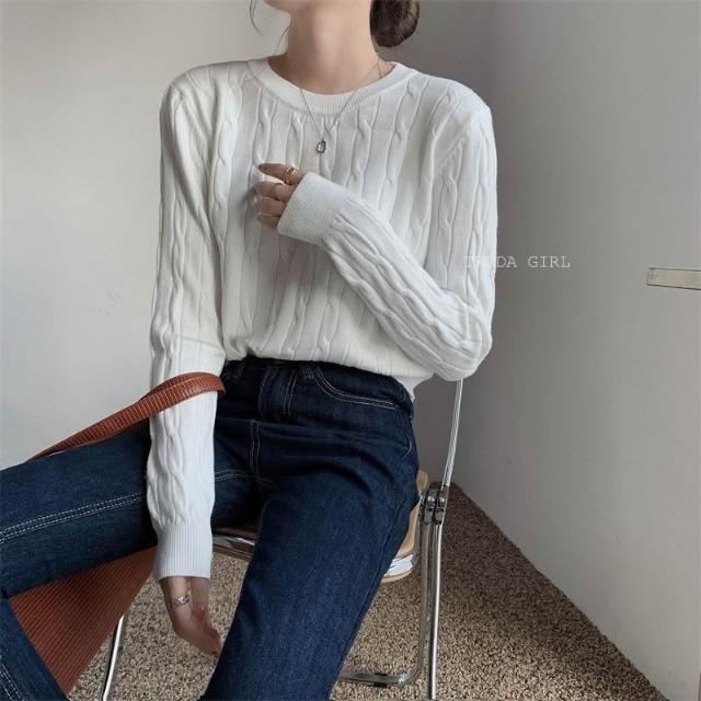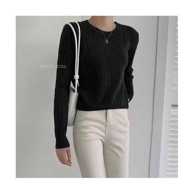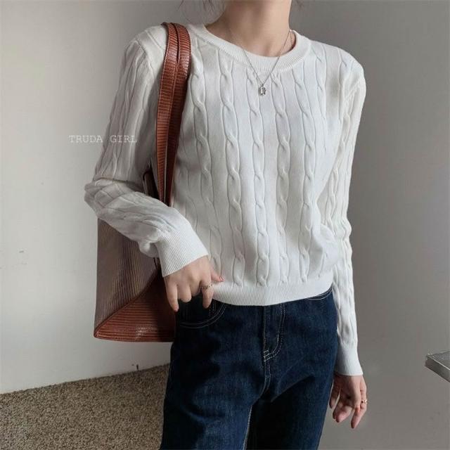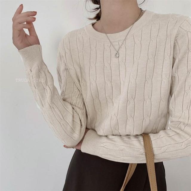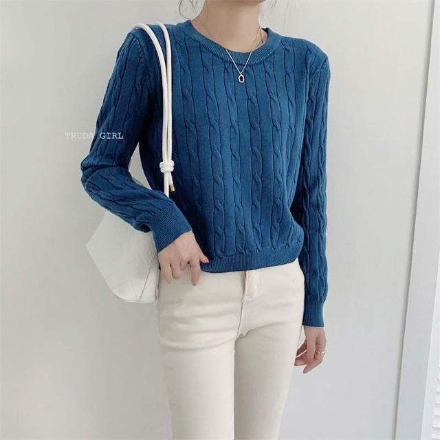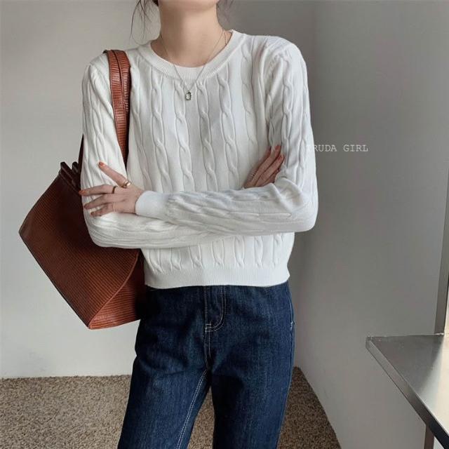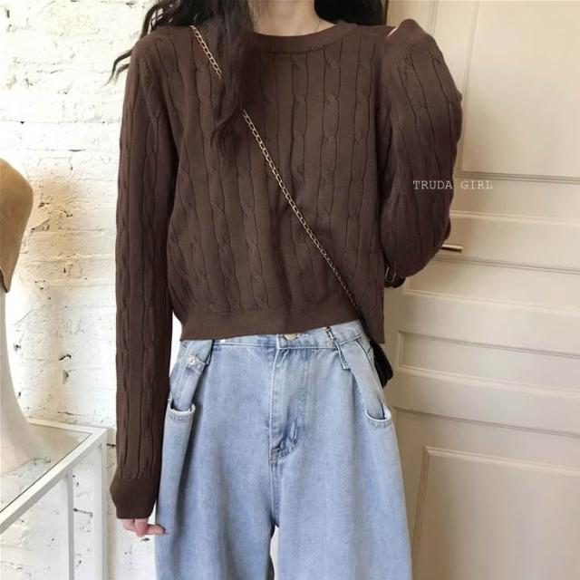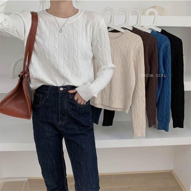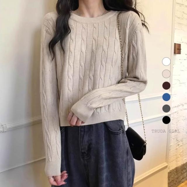 《杜達女孩》質感心動麻花辮針織上衣 圓領針織衫 麻花辮上衣 長袖針織上衣 薄針織上衣 包芯紗上衣 女 短版針織上衣 毛衣