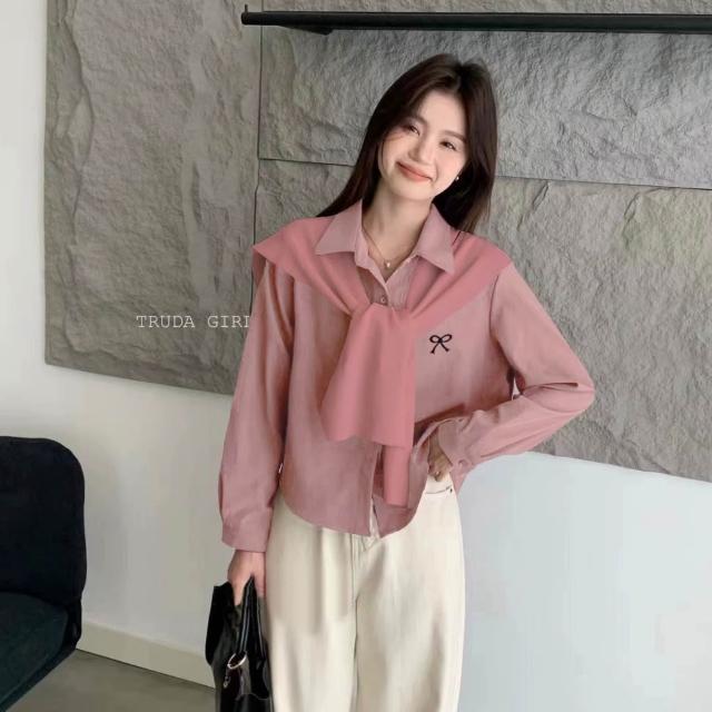 《杜達女孩》刺繡蝴蝶結撞色襯衫披肩兩件套 學院風披肩襯衫 水洗棉襯衫 長袖襯衫 女 高級感寬鬆襯衫 短版襯衫 素面襯衫