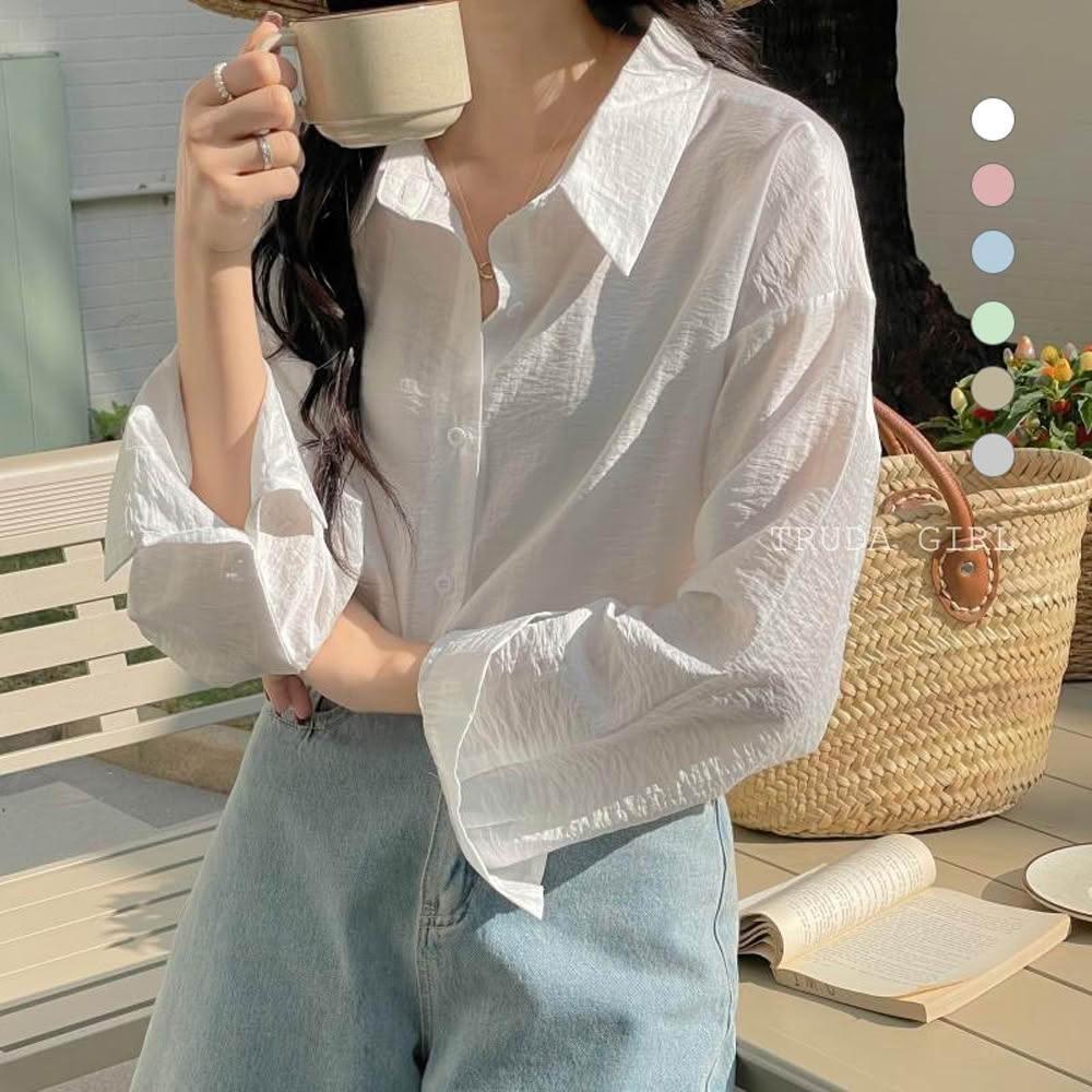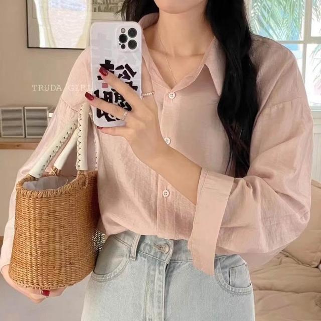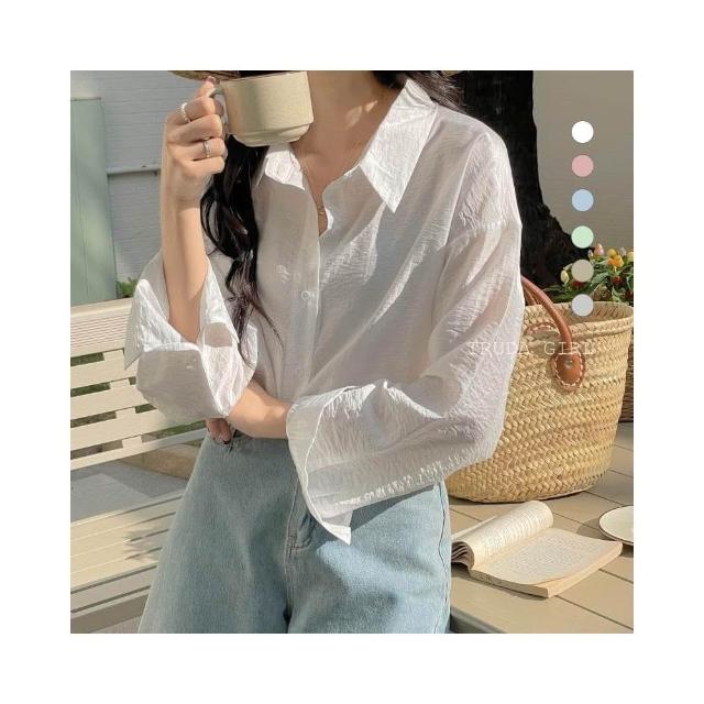 《杜達女孩》韓版簡約仿天絲涼感襯衫 微透膚襯衫 防曬襯衫罩衫 皺皺襯衫 長袖襯衫 罩衫 薄襯衫 防曬 女 寬鬆襯衫 上衣