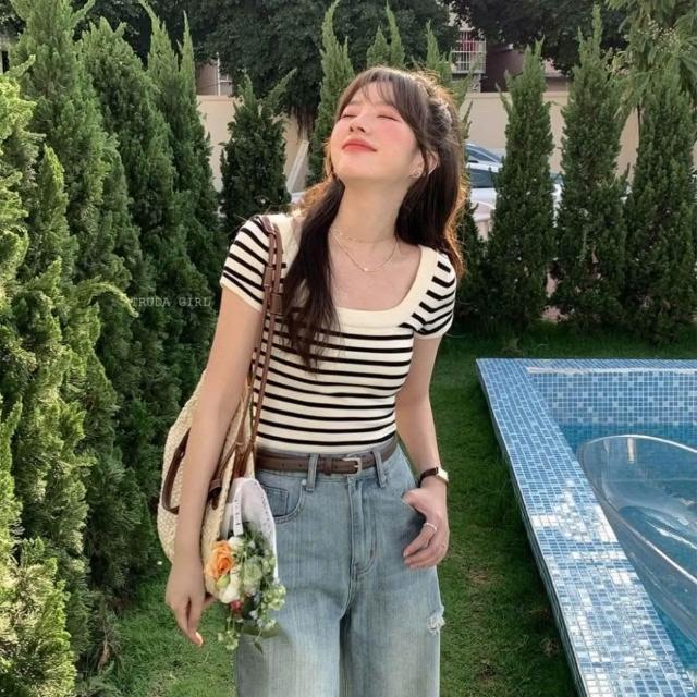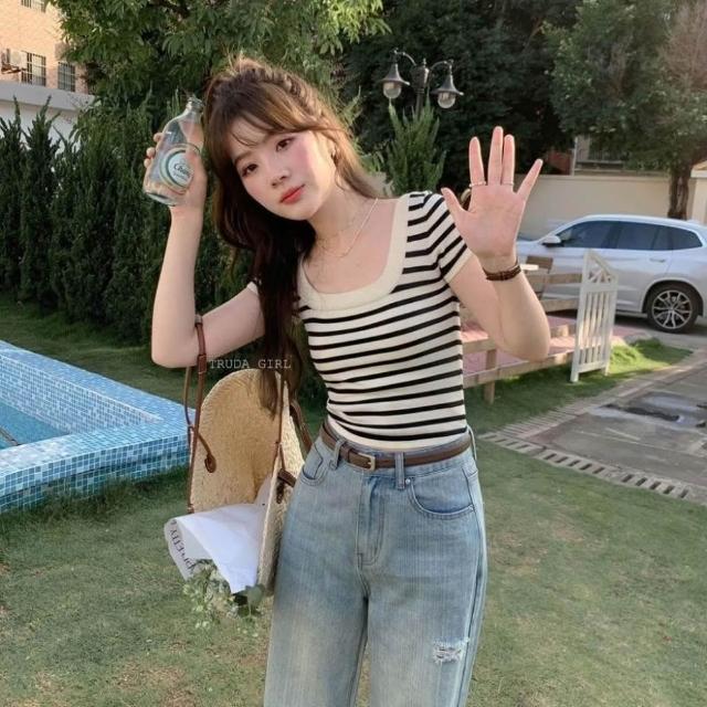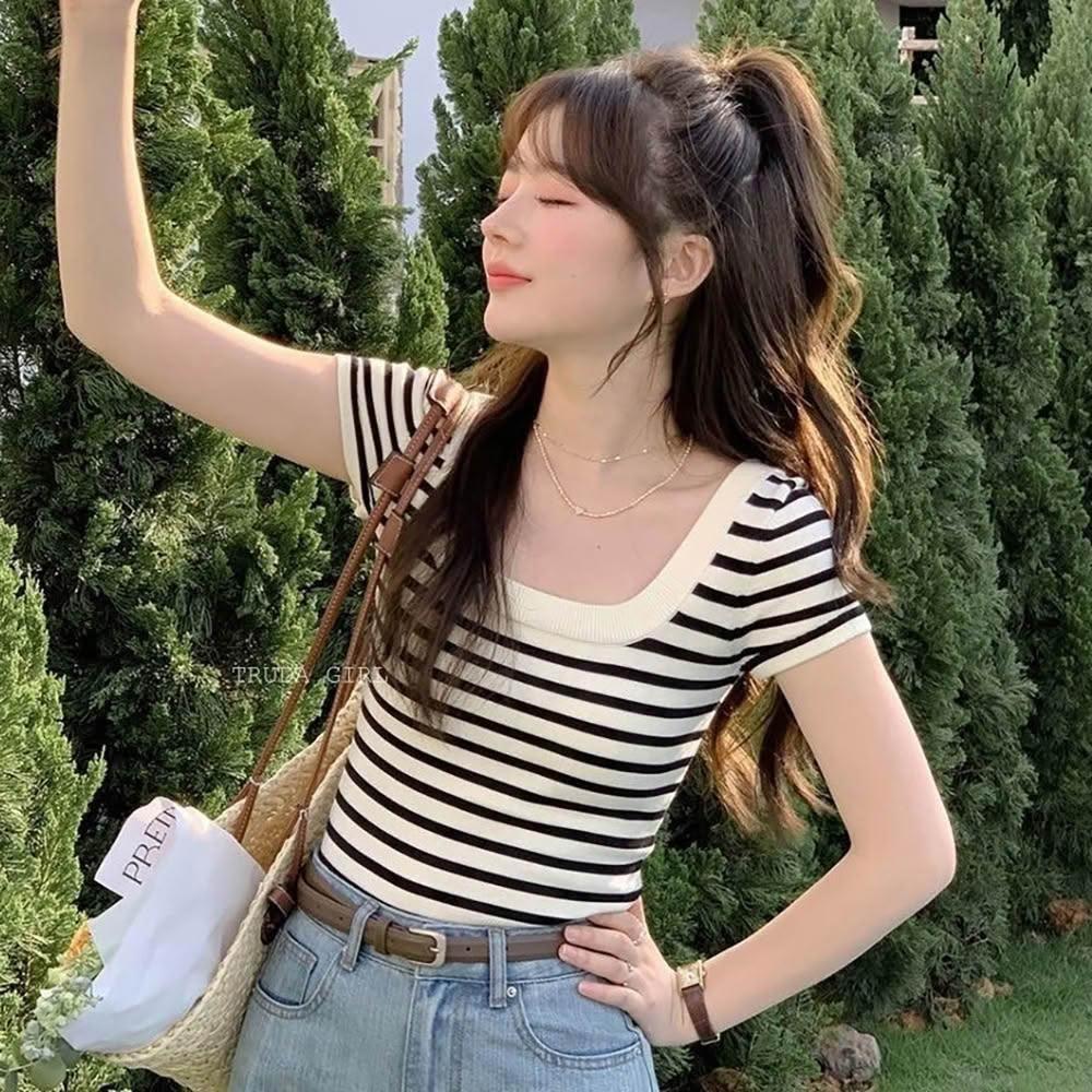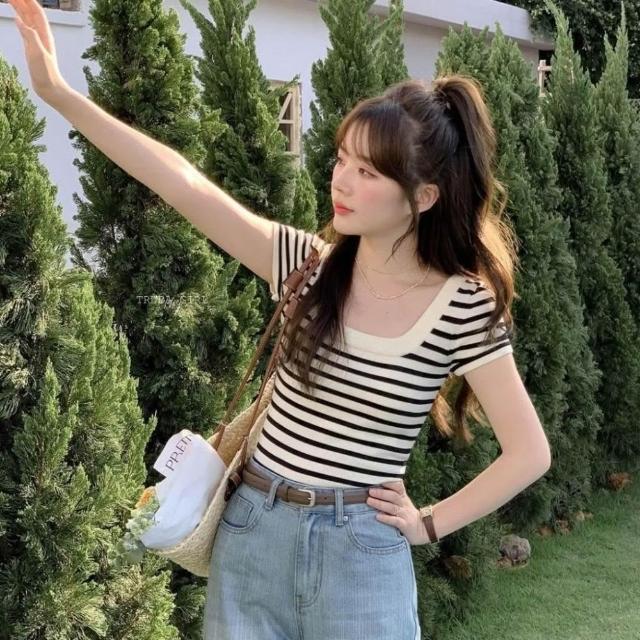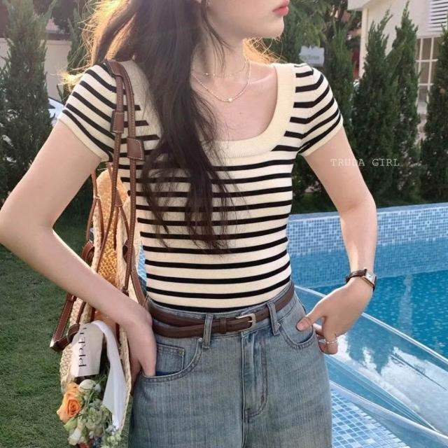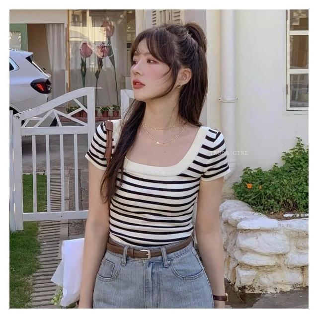 《杜達女孩》氣質方領冰絲針織上衣 方領上衣 短袖上衣 條紋上衣 針織短袖 短袖上衣 女 短袖 短袖條紋 短版上衣 大方領