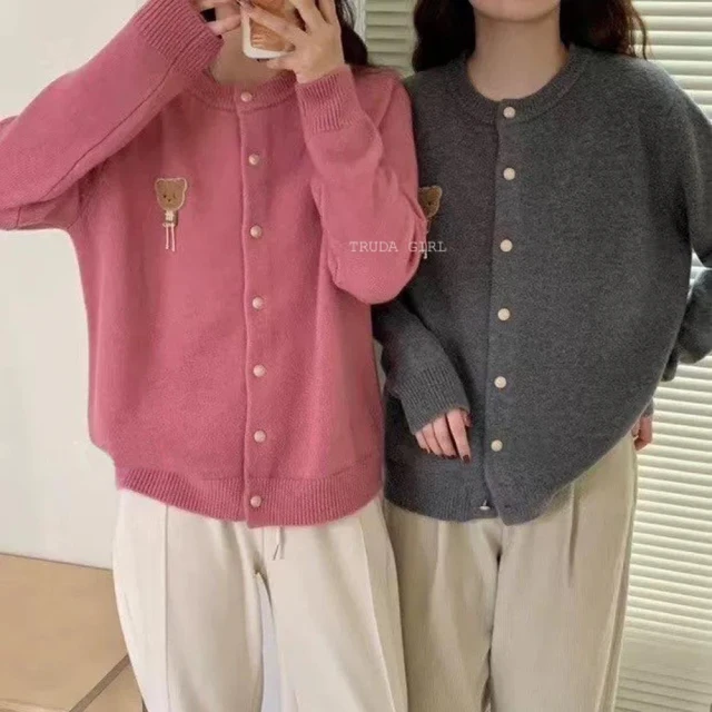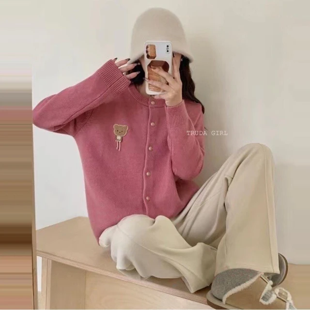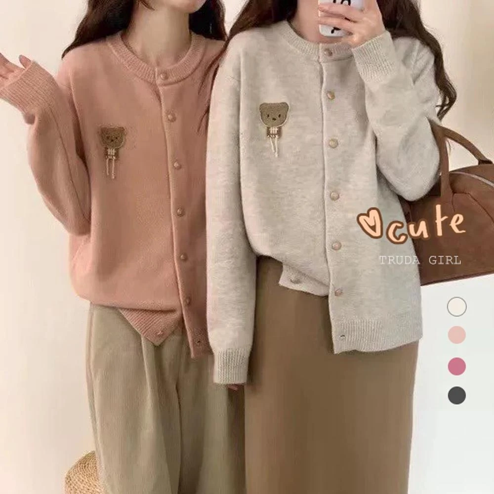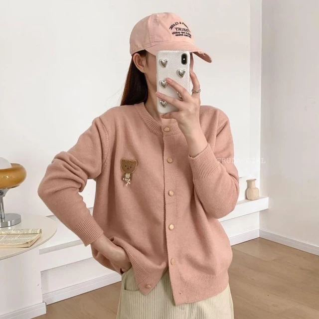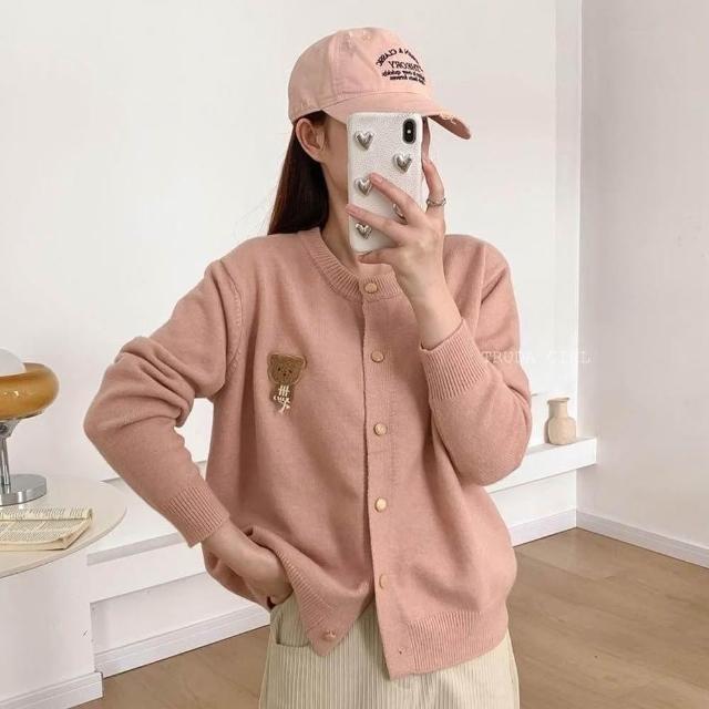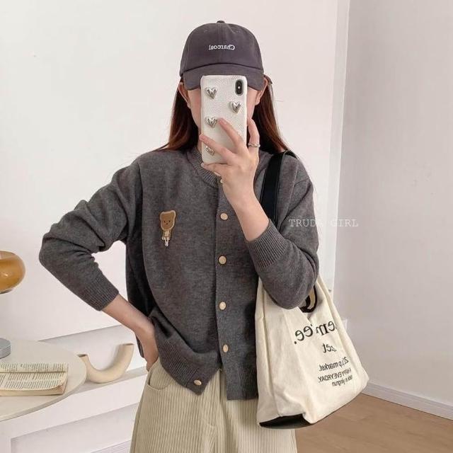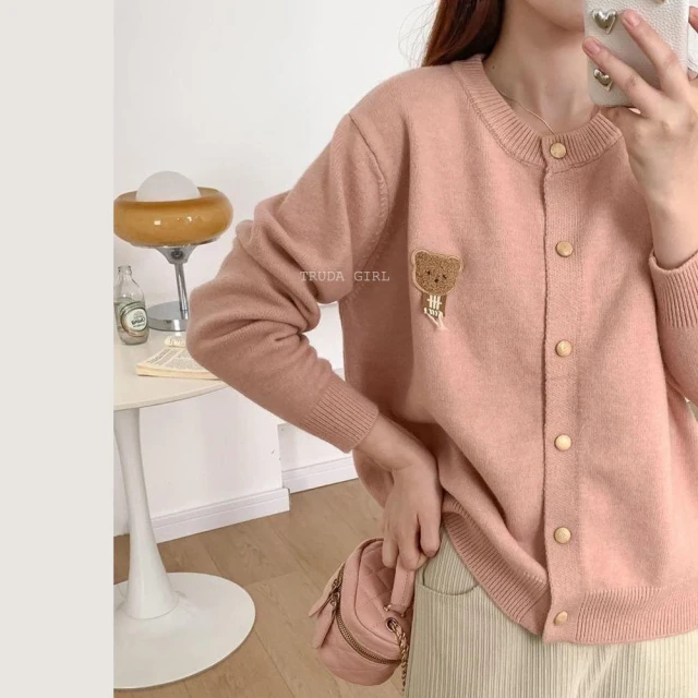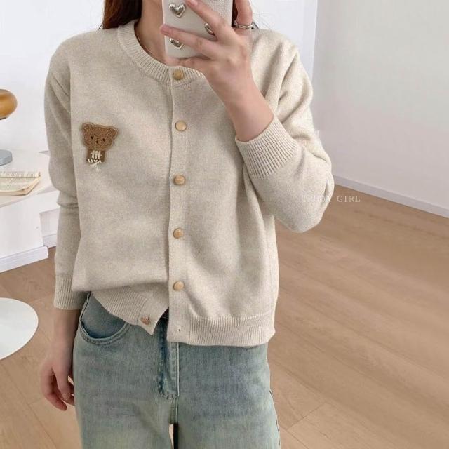 《杜達女孩》高級瑞士熊 北極絨小熊貼布針織外套 霧金圖案扣 秋冬針織外套 小熊外套 羊絨混紡外套 長袖厚外套 毛衣外套