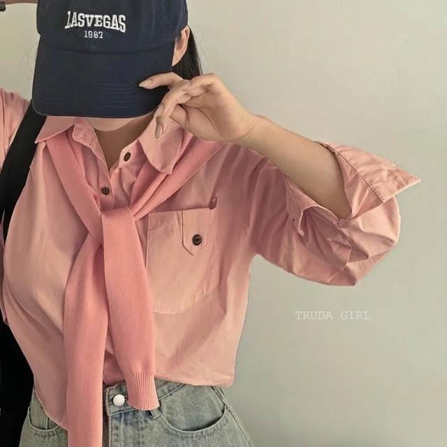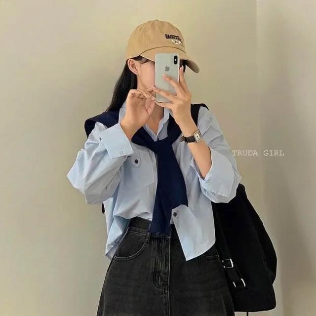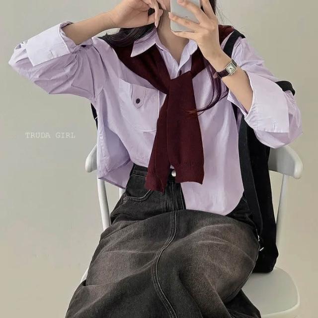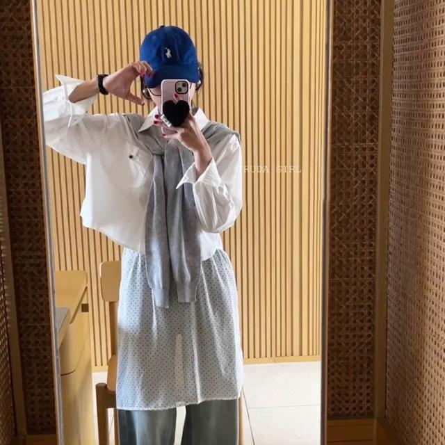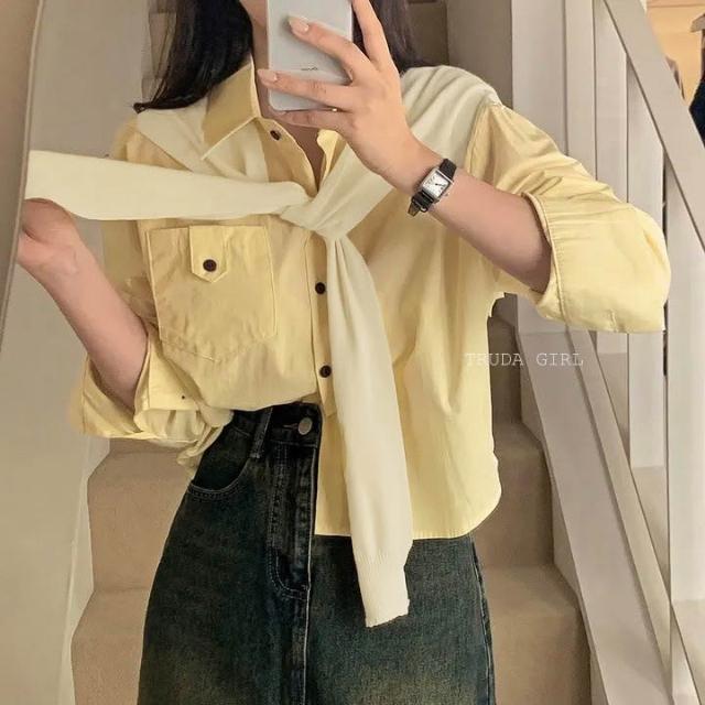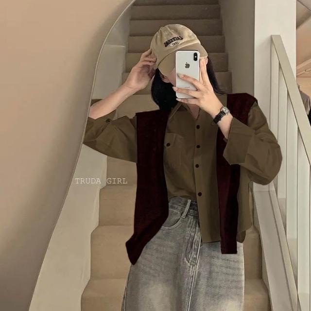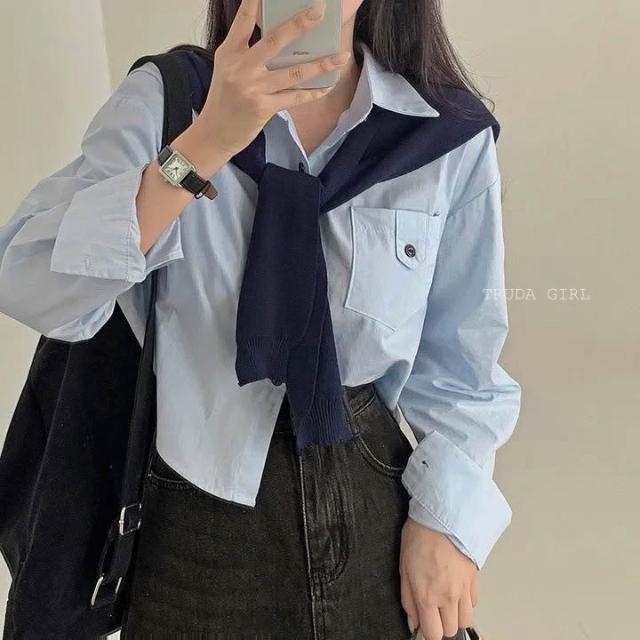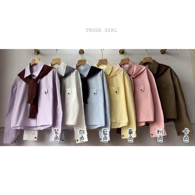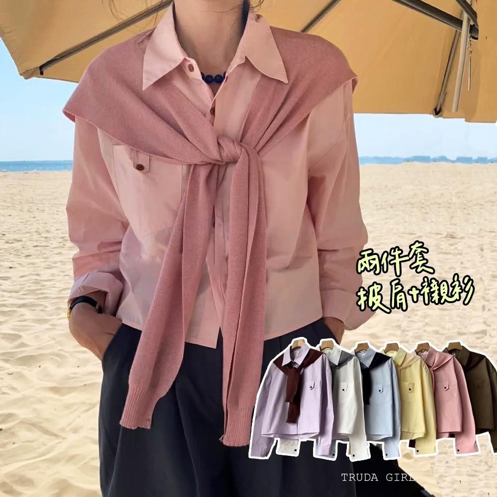 《杜達女孩》休閒胸前口袋扣襯衫披肩兩件套 學院風披肩襯衫 水洗棉襯衫 長袖襯衫 女 高級感寬鬆襯衫 短版襯衫 素面襯衫