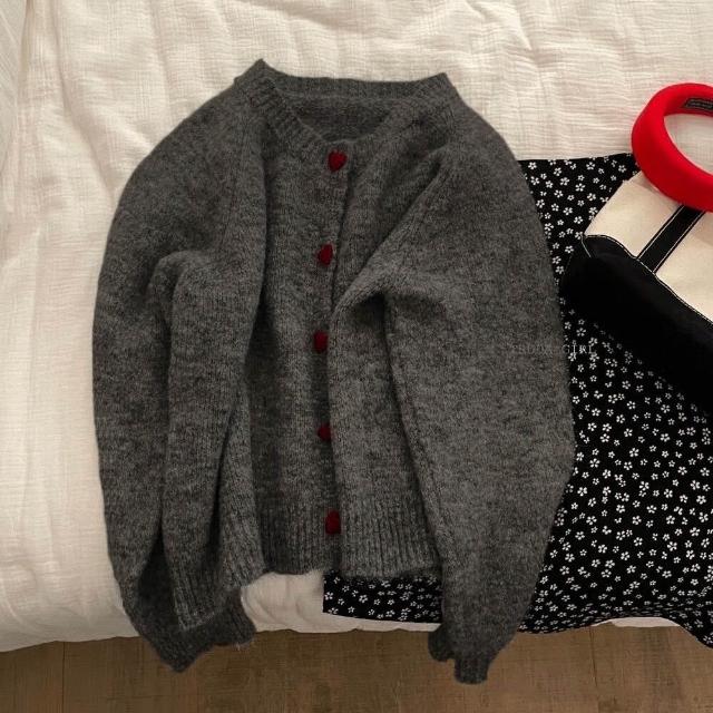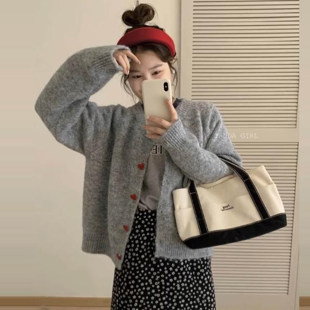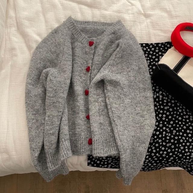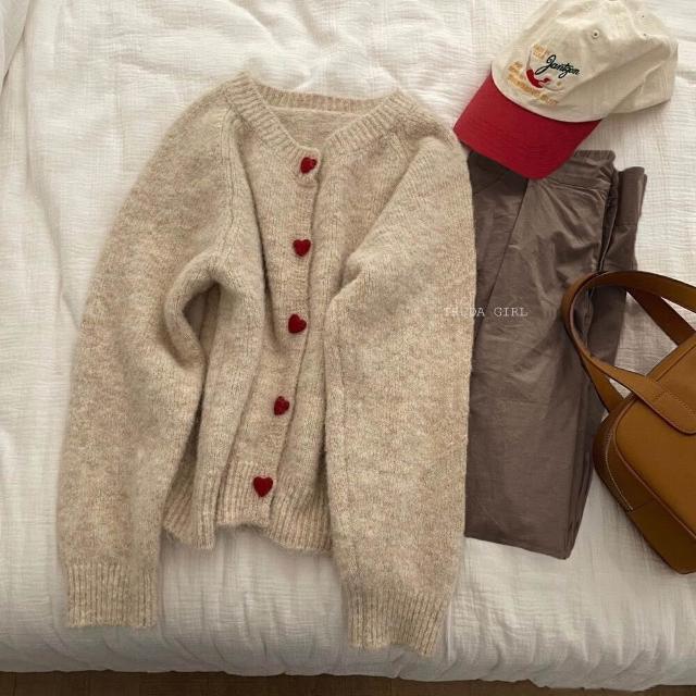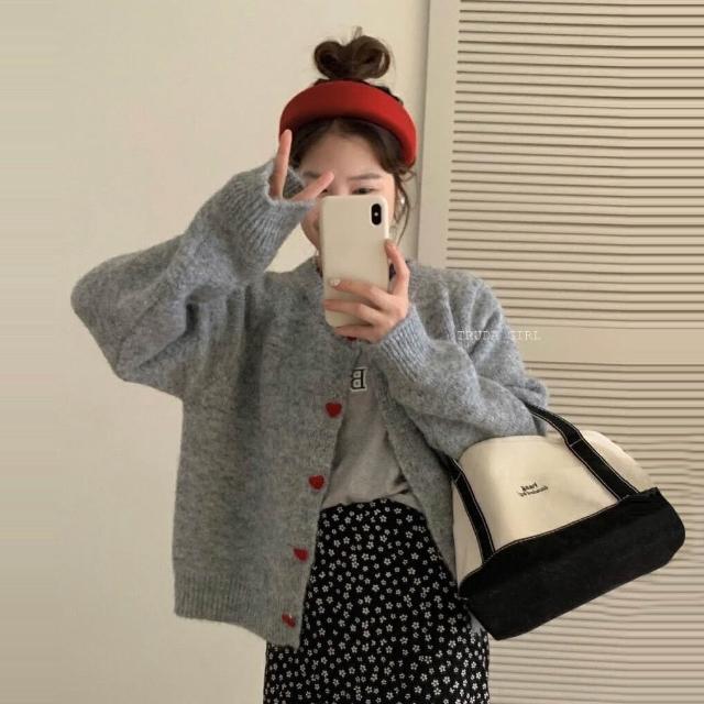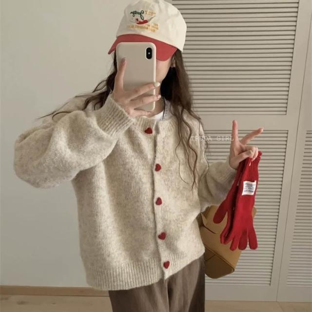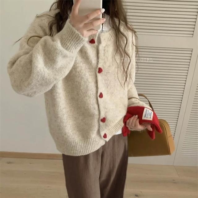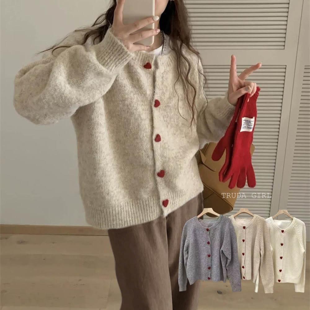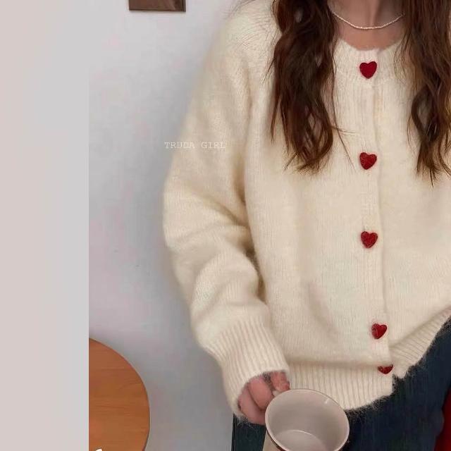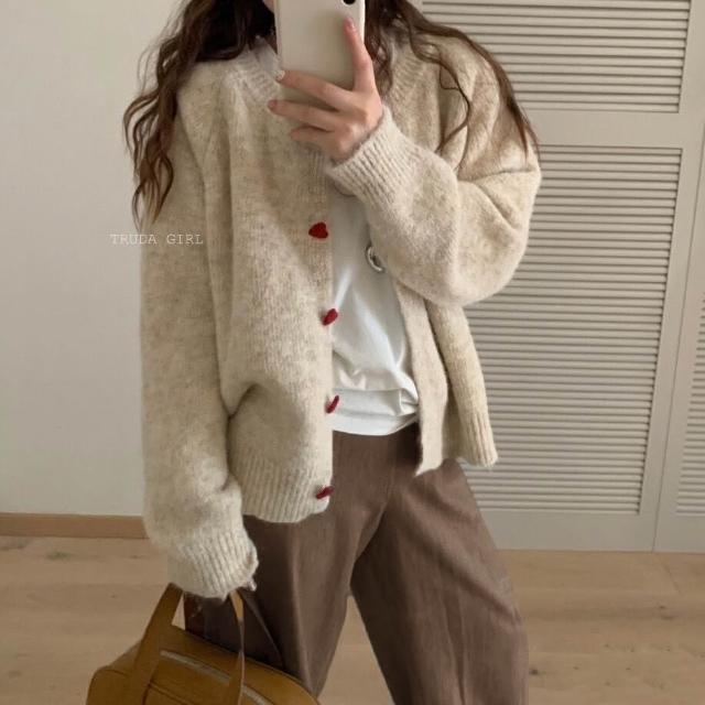 《杜達女孩》愛心ponpon仿羊絨混紡針織外套 愛心扣針織外套 厚針織外套 仿羊絨外套 仿浣熊絨 毛衣外套 秋冬外套 寬鬆外套