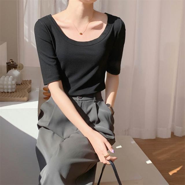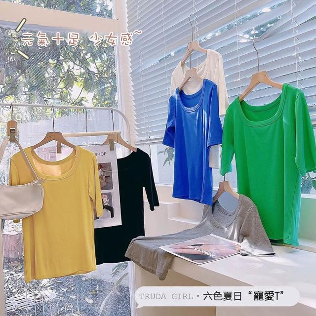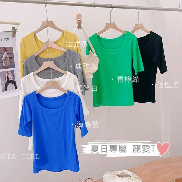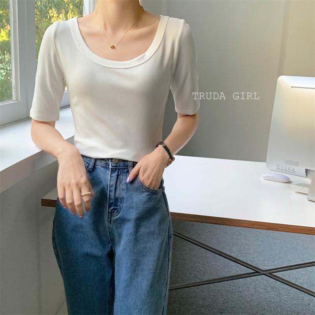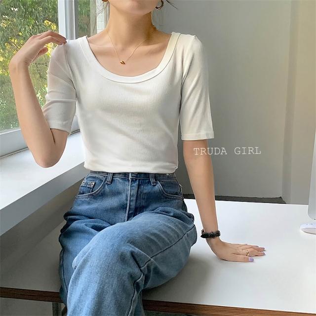 《杜達女孩》超顯氣質彈力螺紋棉U領五分袖上衣 超彈力t 大U領 露鎖骨 中袖 彈力上衣 顯瘦上衣 短袖上衣 五分袖 U領