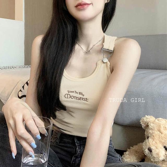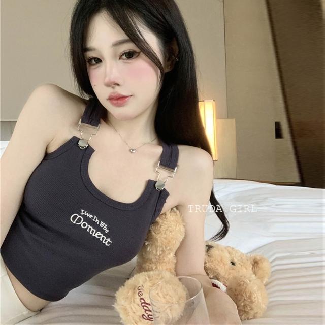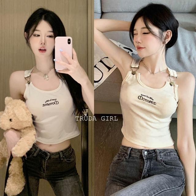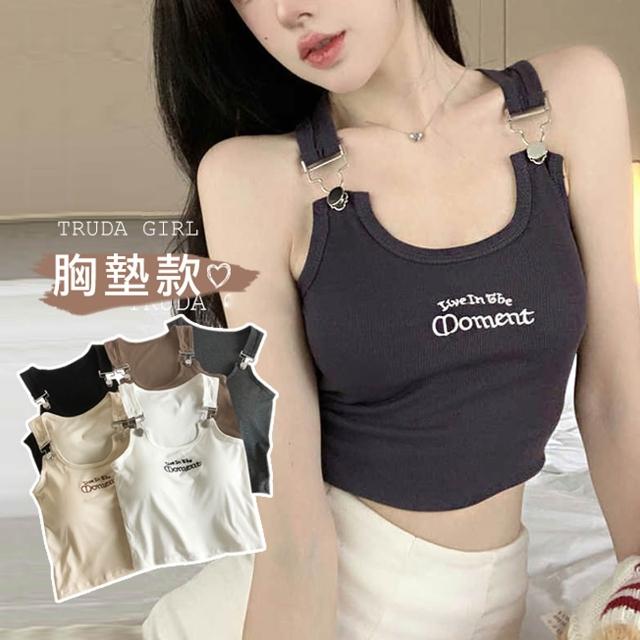 《杜達女孩》推薦必買刺繡字母吊帶背心 BRA吊帶背心 胸墊背心 吊帶背心 吊環露肚背心 短版背心 無袖背心 罩杯吊帶背心