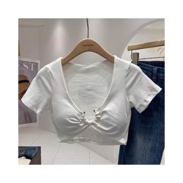 《杜達女孩》甜酒巴黎性感C字扣胸墊上衣 露胸上衣 性感上衣 胸墊上衣 罩杯上衣 胸墊T 性感短袖上衣 夜店衣服 胸前挖空