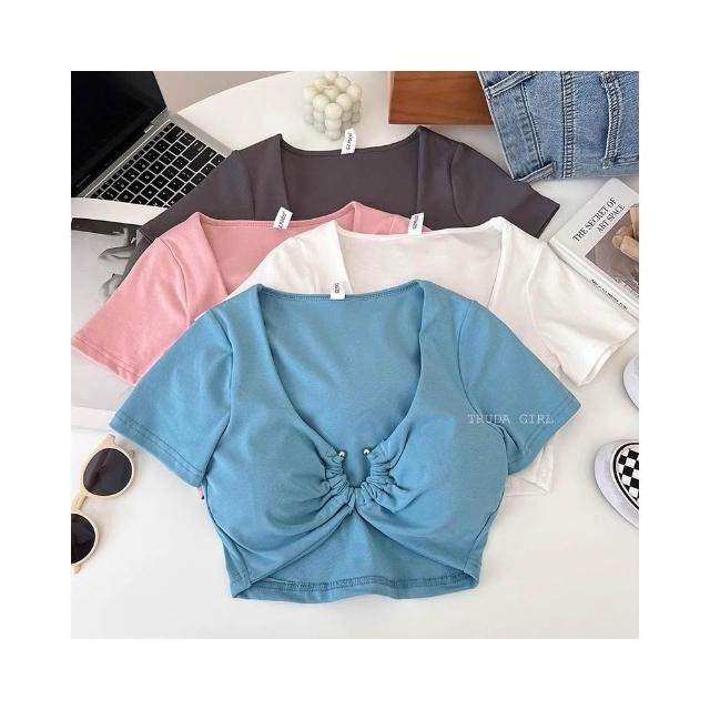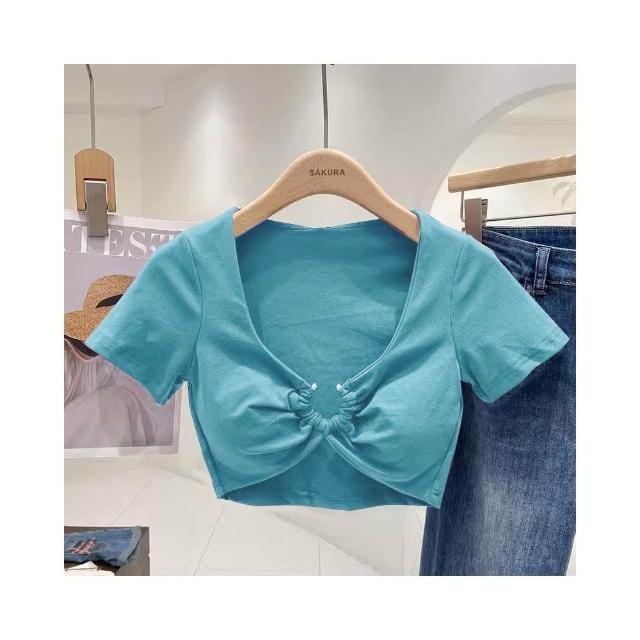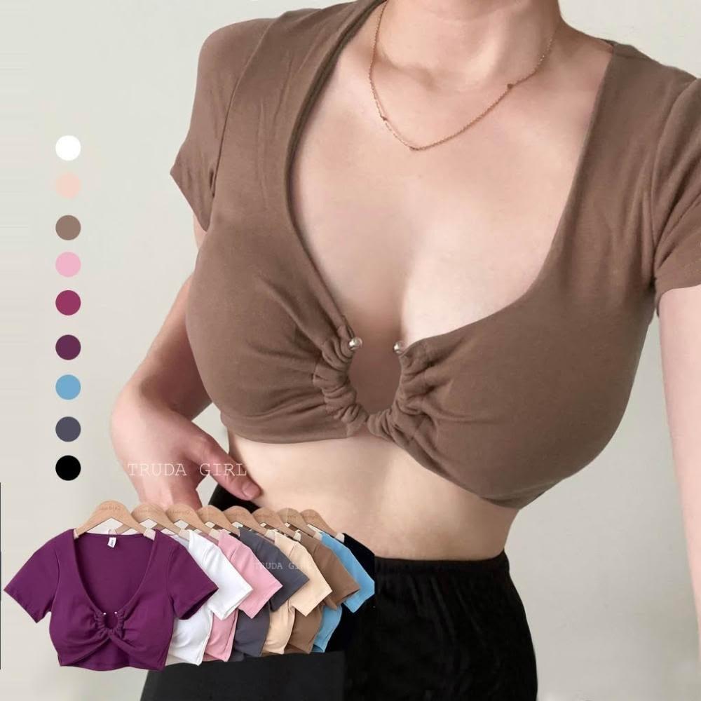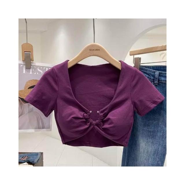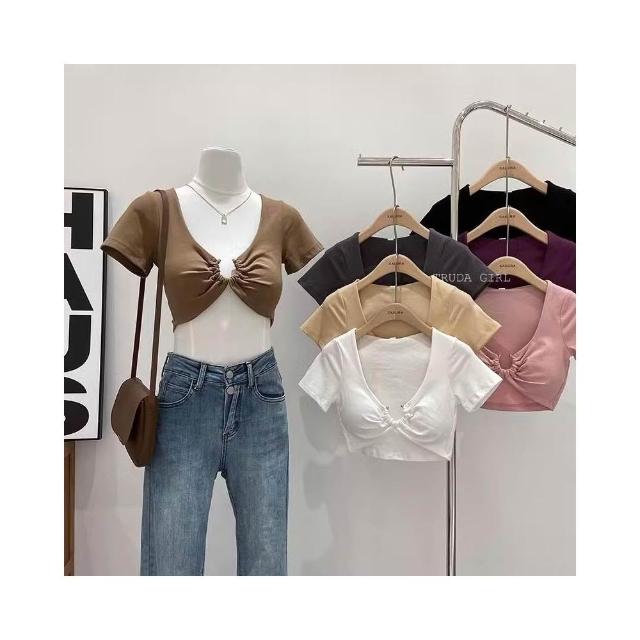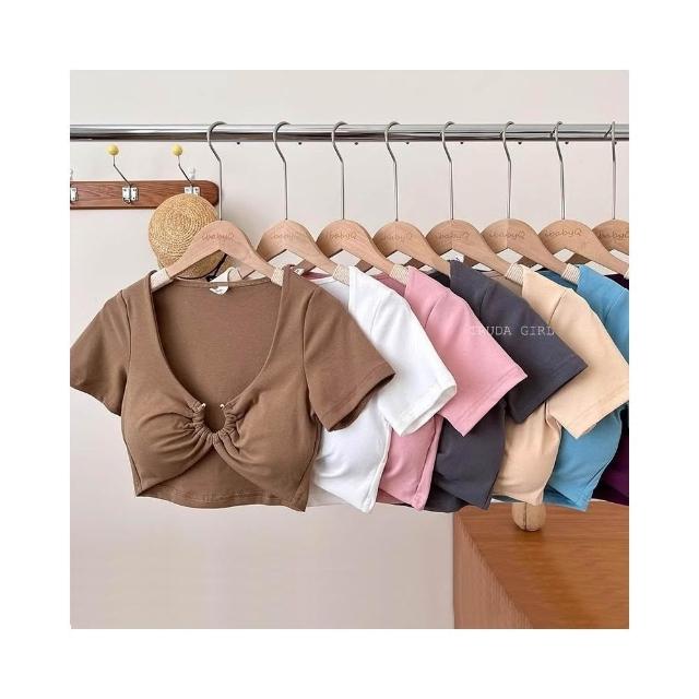 《杜達女孩》甜酒巴黎性感C字扣胸墊上衣 露胸上衣 性感上衣 胸墊上衣 罩杯上衣 胸墊T 性感短袖上衣 夜店衣服 胸前挖空