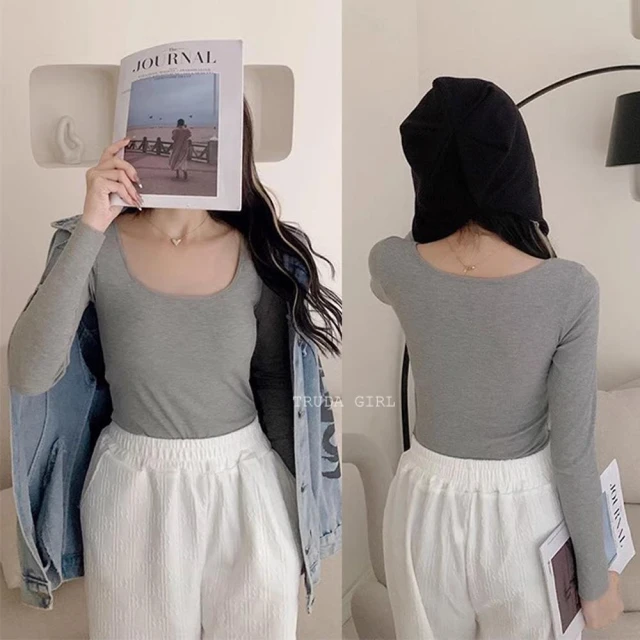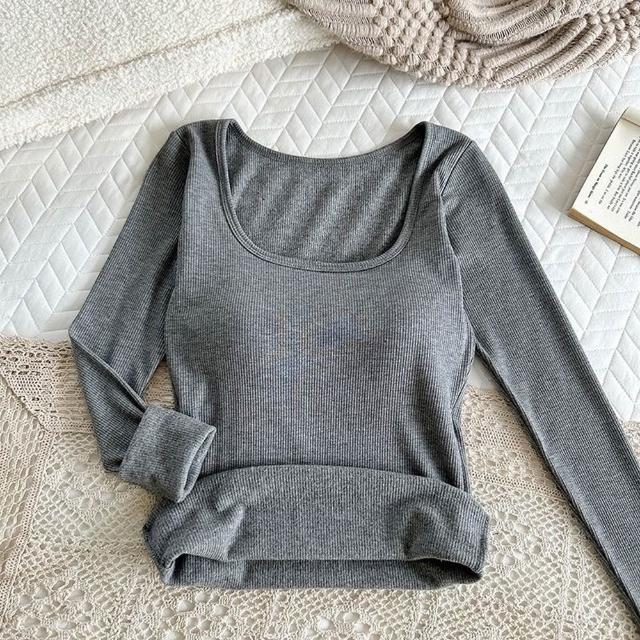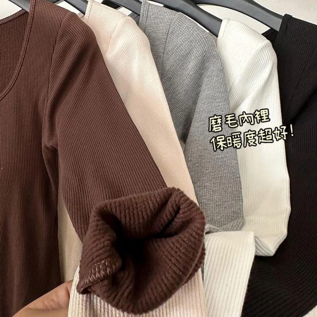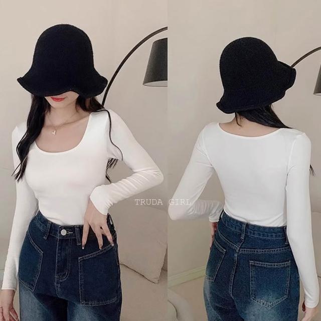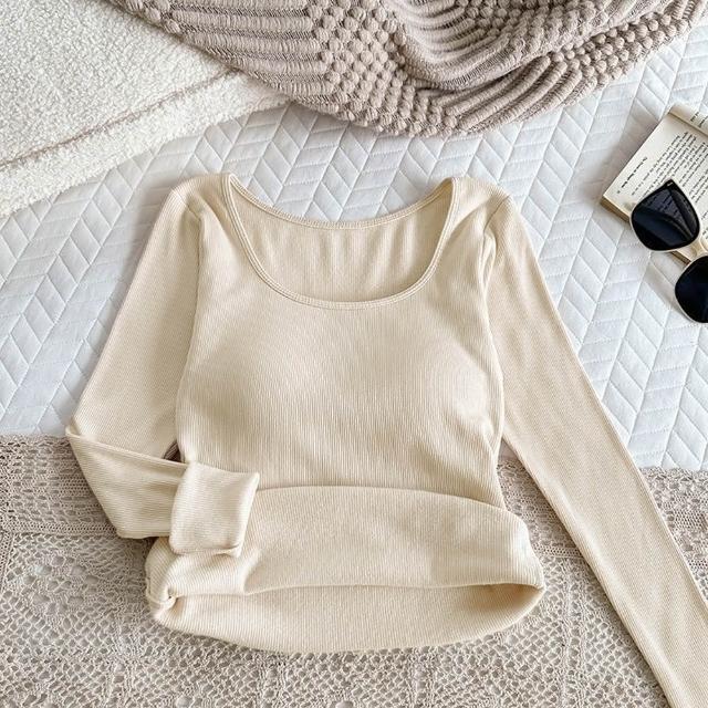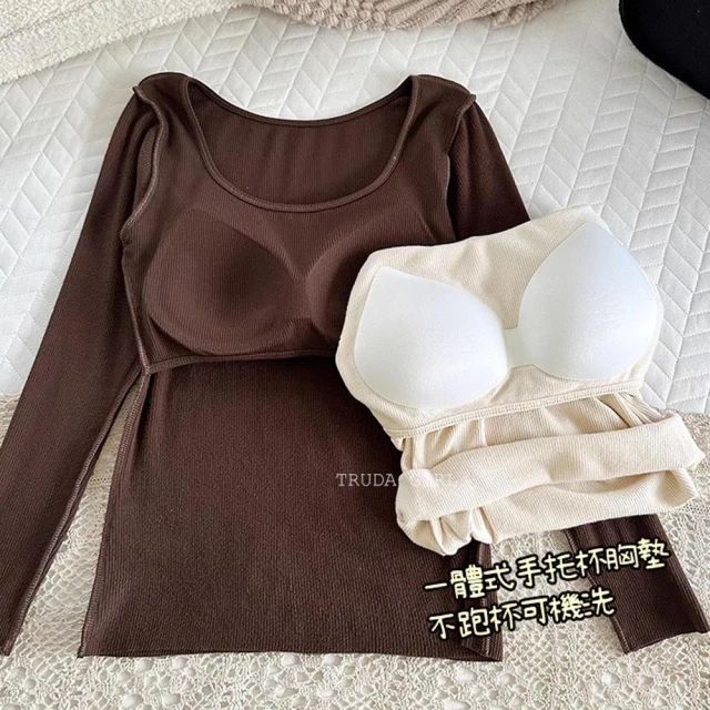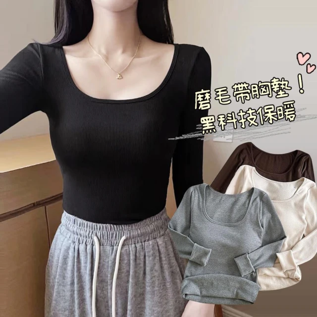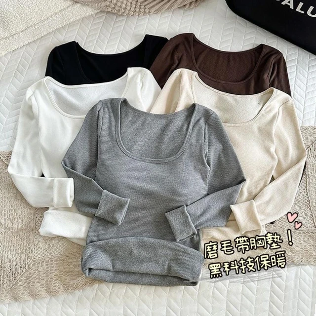 《杜達女孩》帶胸墊內磨毛保暖內搭 方領胸墊上衣 棉質長袖上衣 加絨內搭上衣 保暖螺紋上衣 方領上衣 罩杯式上衣 刷毛內搭