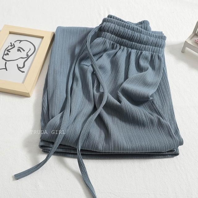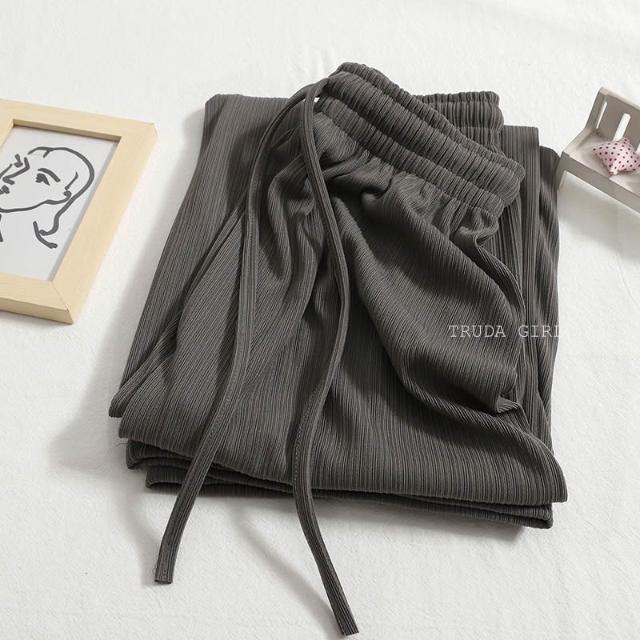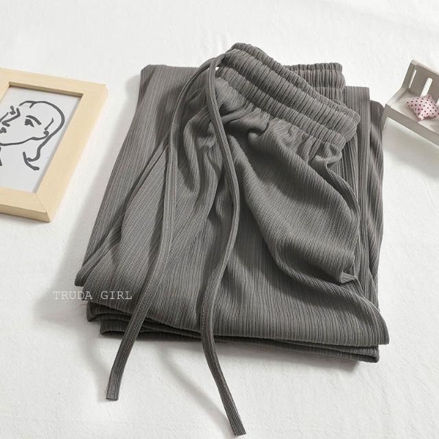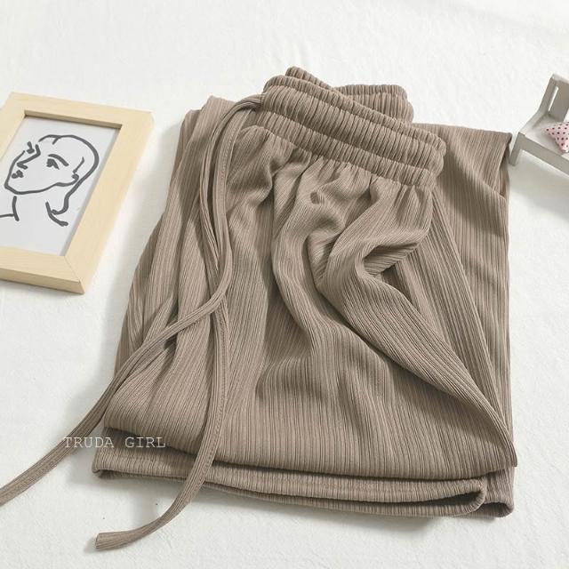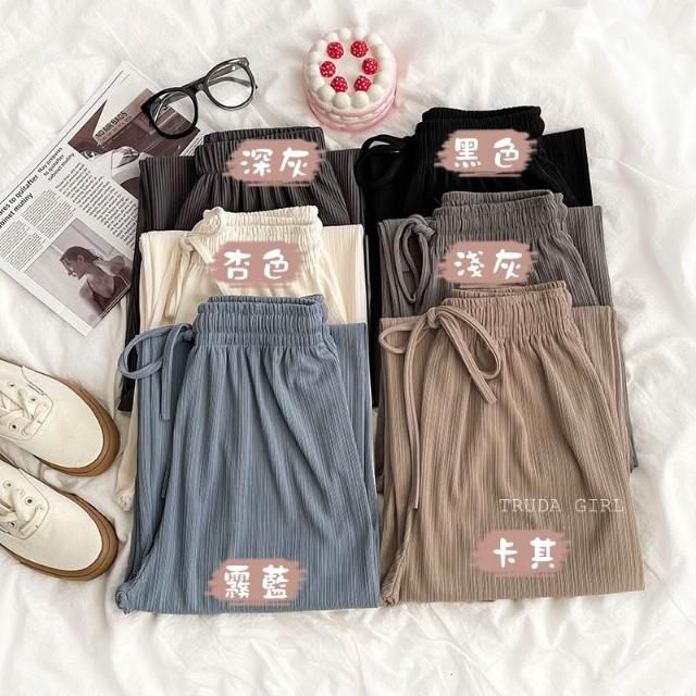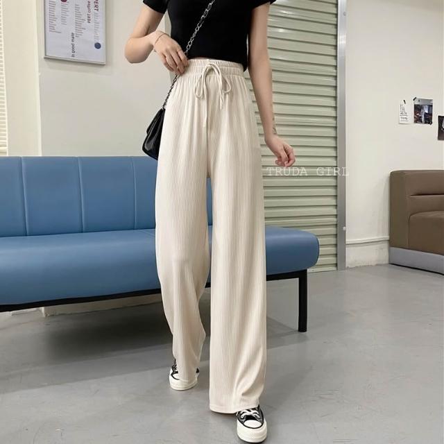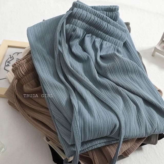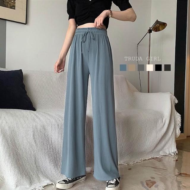 《杜達女孩》高品質豎條紋路垂感鬆緊腰闊腿褲 落地褲 拖地褲 休閒長褲 寬褲 冰絲寬褲 闊腿褲 長褲 涼感褲 女