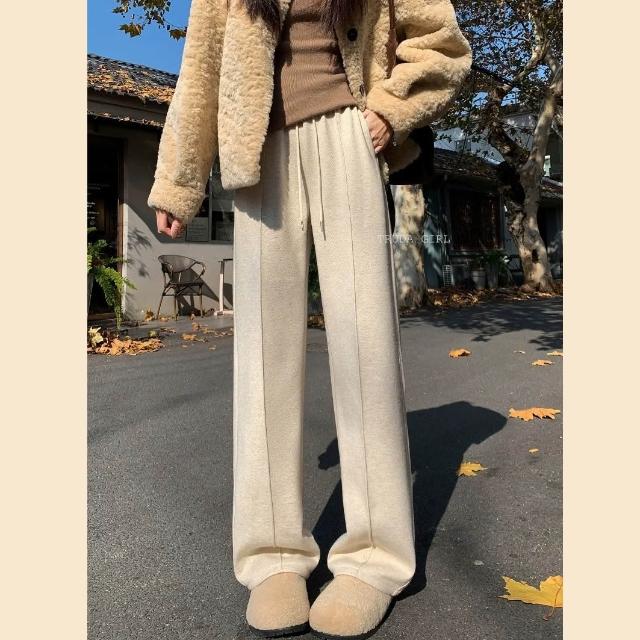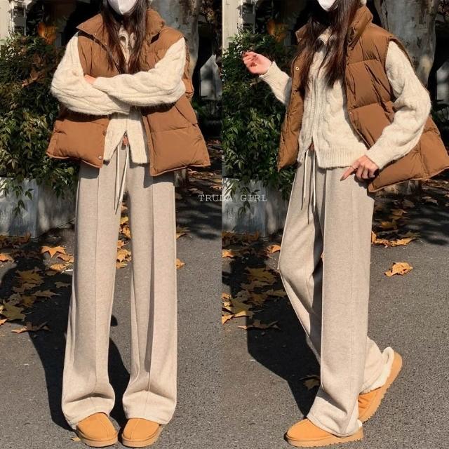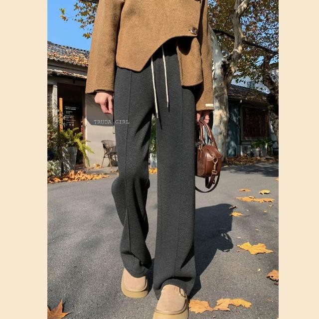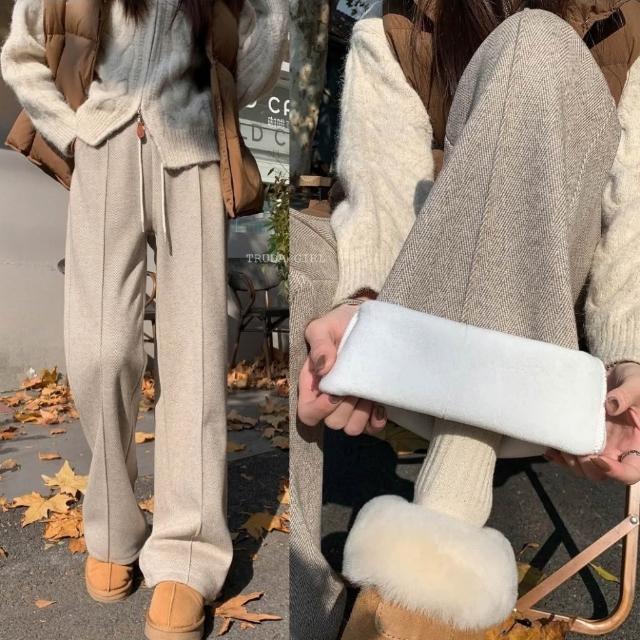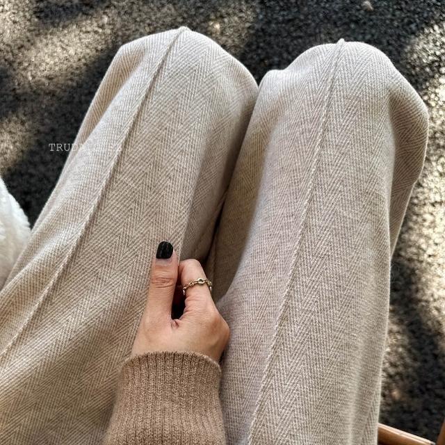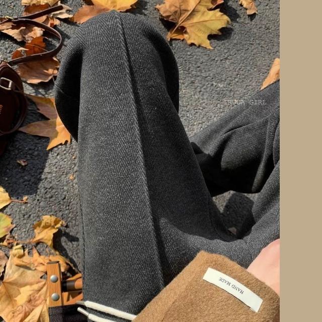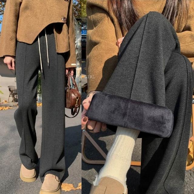 《杜達女孩》等到一件好褲子 輕職感人字紋寬褲 中線口袋款 鬆緊腰寬褲 加絨長褲 加厚褲子 女 秋冬長褲 褲子 西裝長褲
