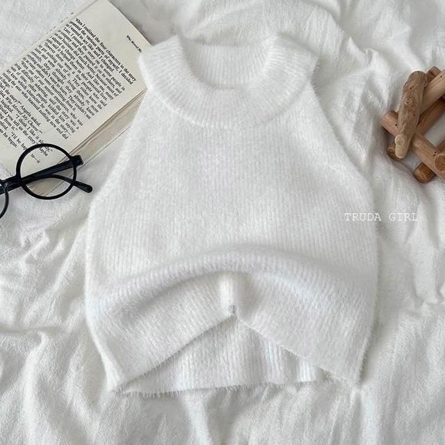 《杜達女孩》甜心嗲軟妹 秋冬仿水貂絨無袖掛脖背心上衣 貂毛背心上衣 針織無袖背心 毛絨上衣 毛茸茸針織上衣 短版上衣