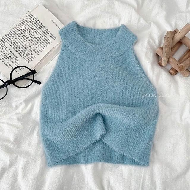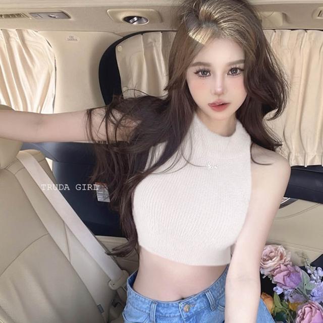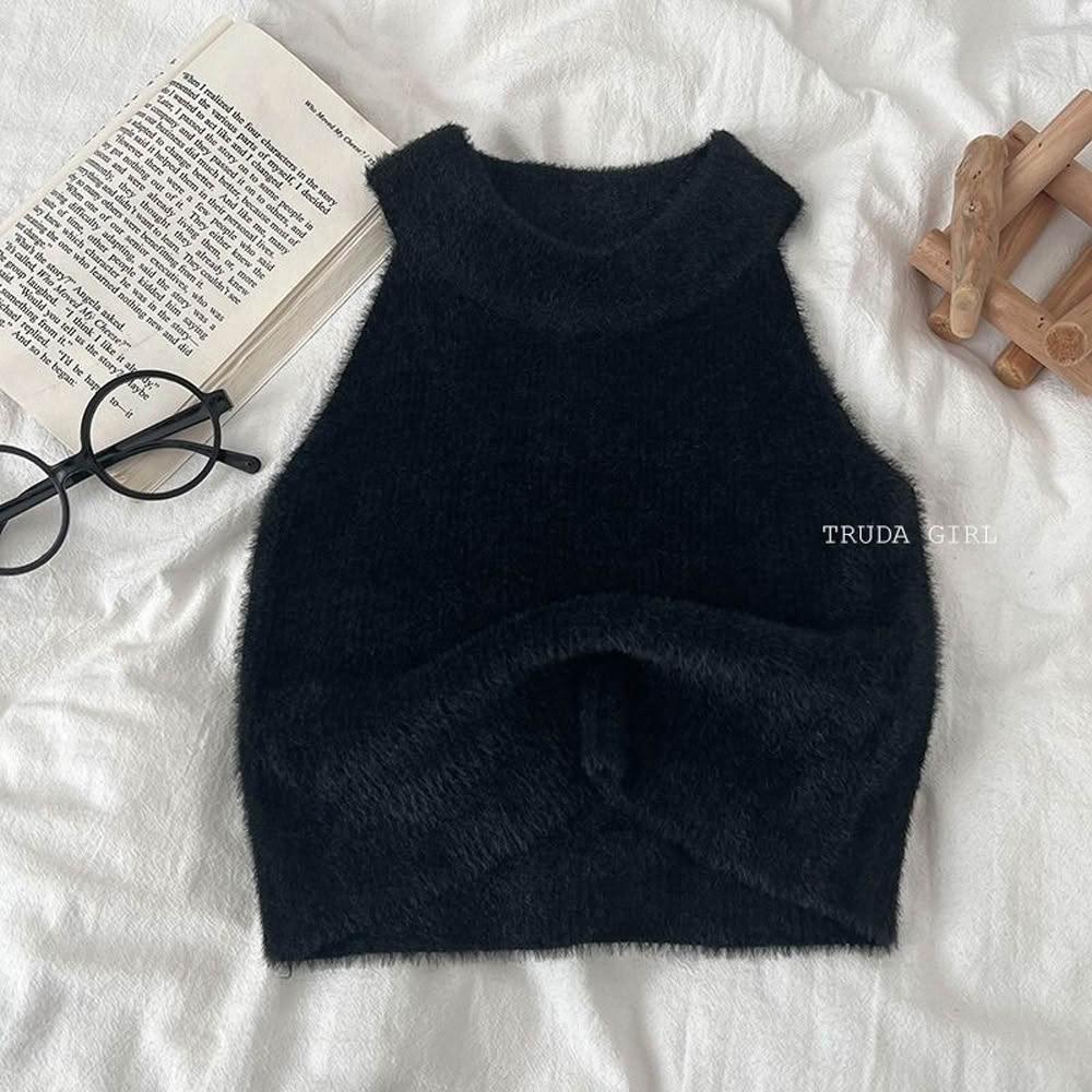 《杜達女孩》甜心嗲軟妹 秋冬仿水貂絨無袖掛脖背心上衣 貂毛背心上衣 針織無袖背心 毛絨上衣 毛茸茸針織上衣 短版上衣