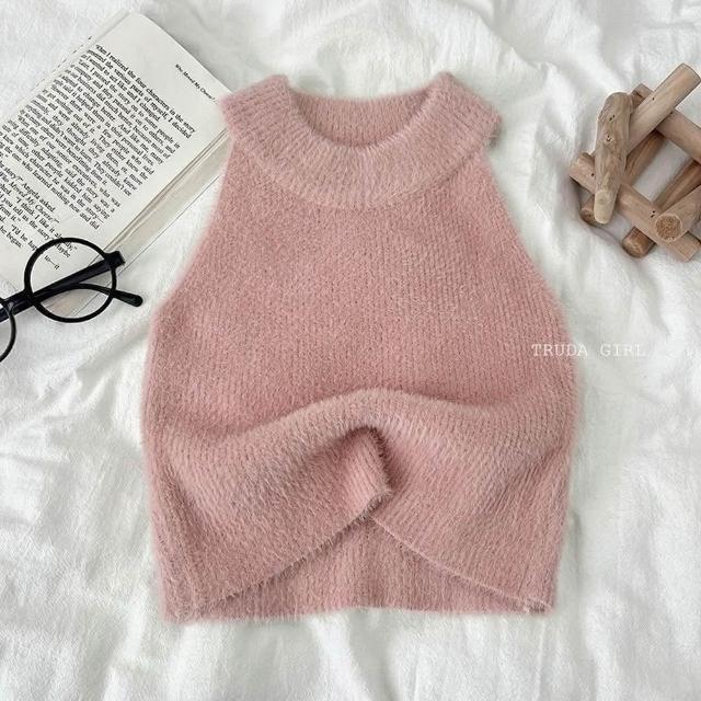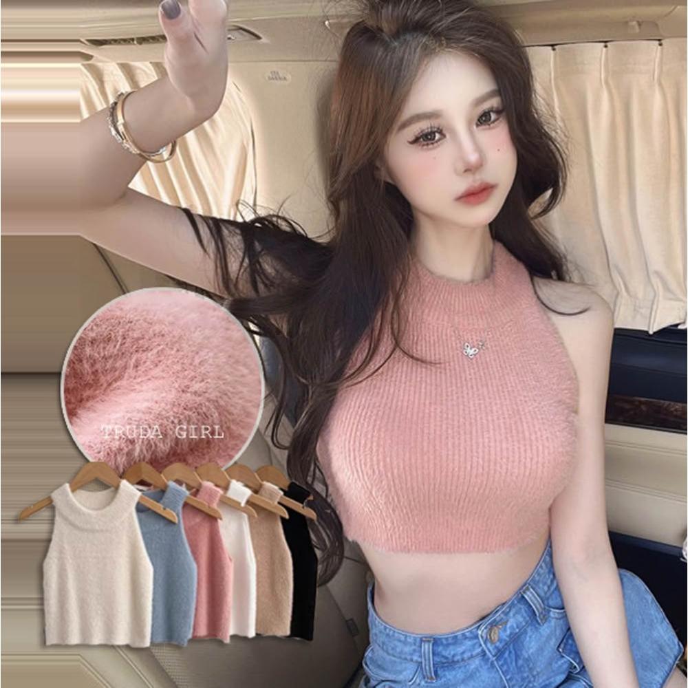 《杜達女孩》甜心嗲軟妹 秋冬仿水貂絨無袖掛脖背心上衣 貂毛背心上衣 針織無袖背心 毛絨上衣 毛茸茸針織上衣 短版上衣