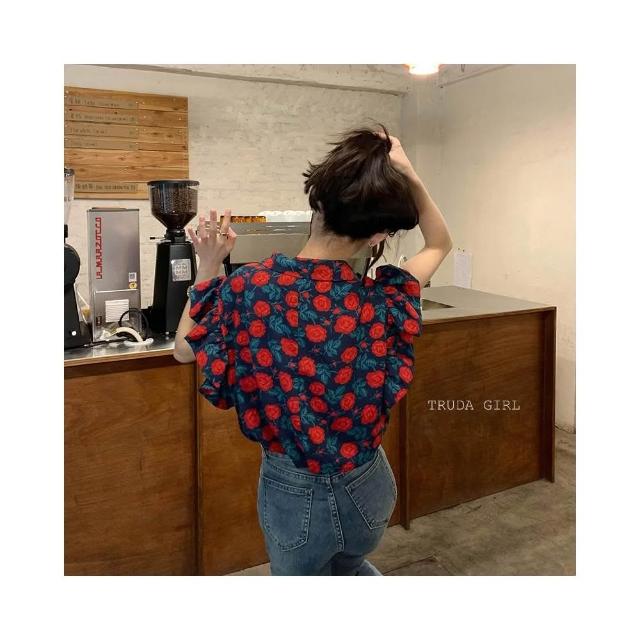 《杜達女孩》千層復古玫瑰短袖襯衫 S-XL飛飛袖荷葉邊碎花襯衫 文藝襯衫 碎花襯衫 西裝領短袖襯衫 短袖雪紡襯衫 花襯衫