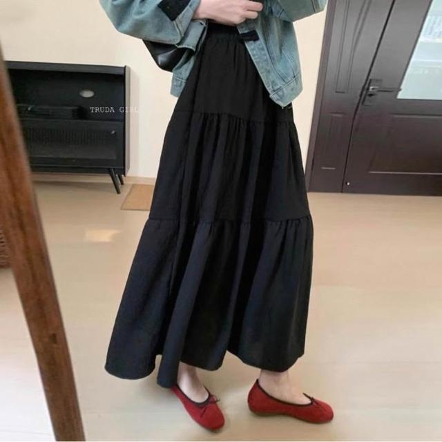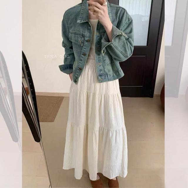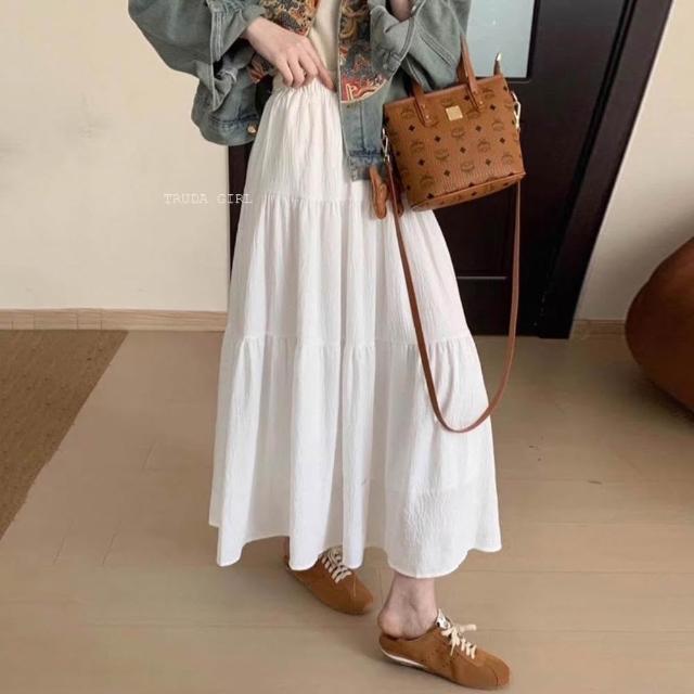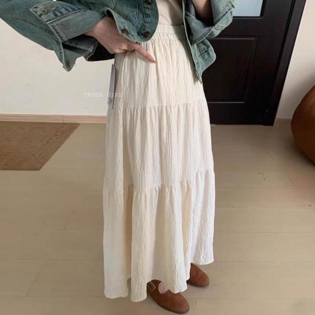 《杜達女孩》壓皺紋理雲感裙 有内裡蛋糕裙 傘狀裙 A字長裙 半身裙 飄逸長裙 鬆緊腰長裙 白色裙子 女 裙子 度假裙子
