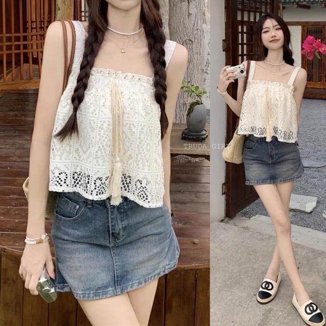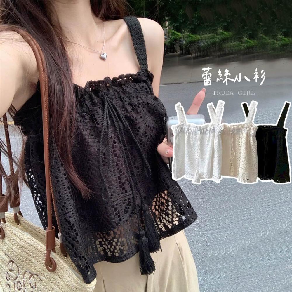 《杜達女孩》甜漾蕾絲流蘇吊帶上衣 傘狀上衣 娃娃裝 波西米亞 蕾絲上衣 平口吊帶上衣 女 鉤花蕾絲 鏤空針織上衣 度假風