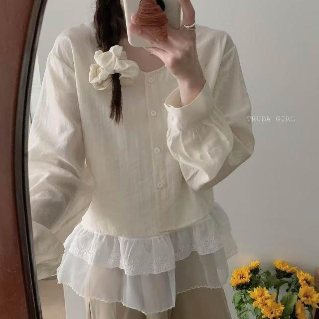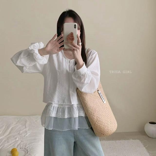 - 微泡泡袖與細節蕾絲拼接