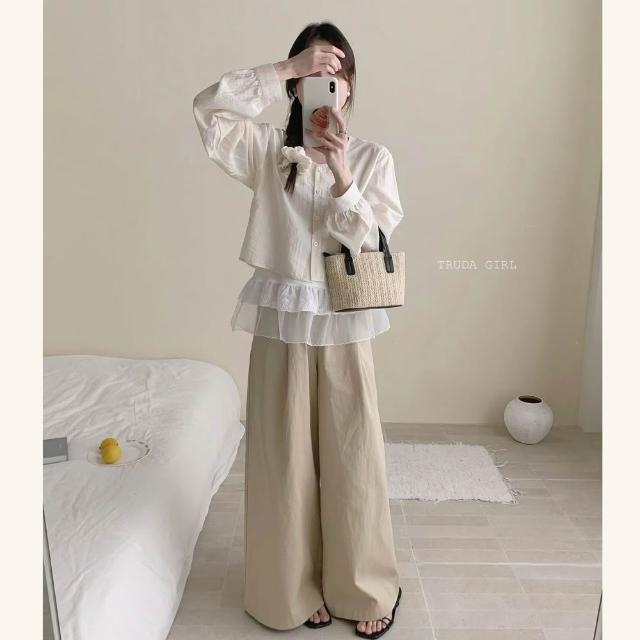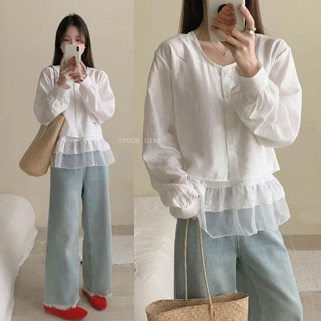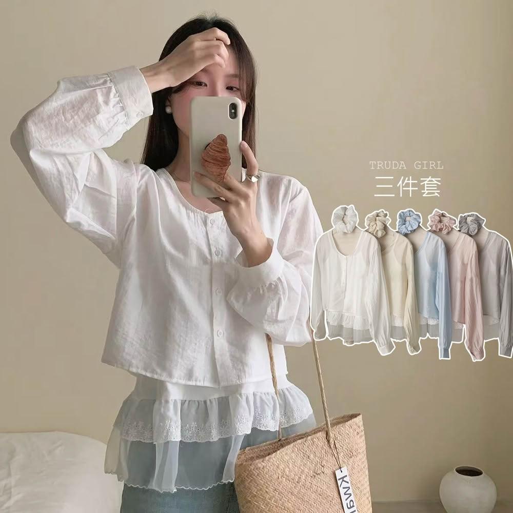 《杜達女孩》甜美層次穿搭三件套 襯衫+吊帶+髮圈三件式 疊穿上衣 雪紡上衣 透膚罩衫蕾絲上衣 氣質上衣 蛋糕裙 防曬罩衫