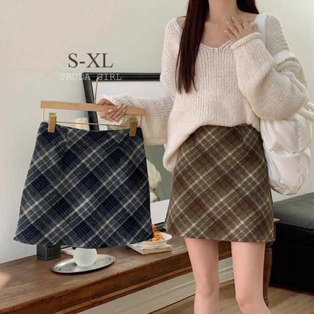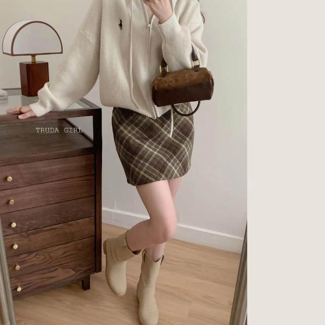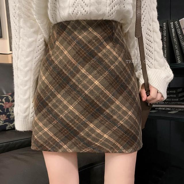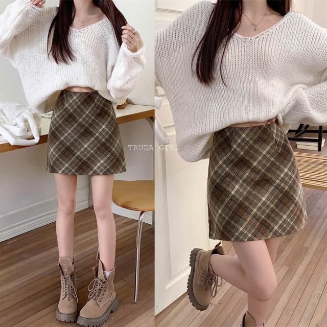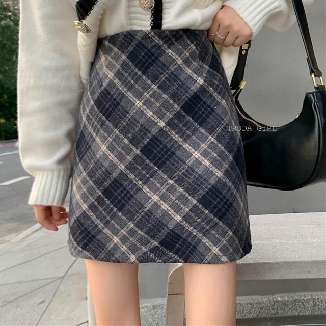 《杜達女孩》浪漫逆襲 秋冬毛呢格紋短裙 防走光格紋高腰短裙 格子裙 菱格毛呢短裙 包臀裙 窄裙 裙子 a字裙 呢子短裙