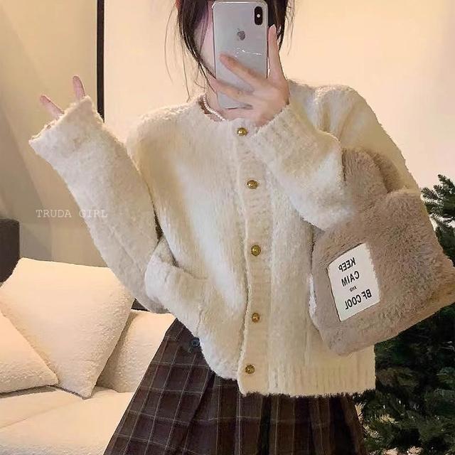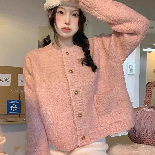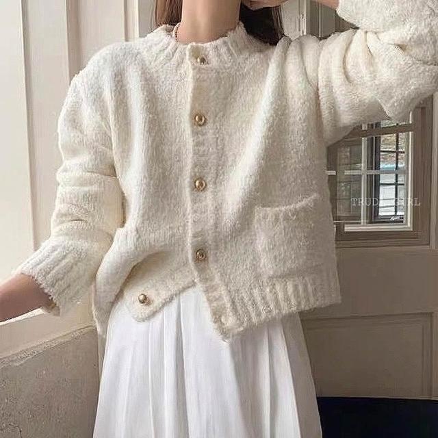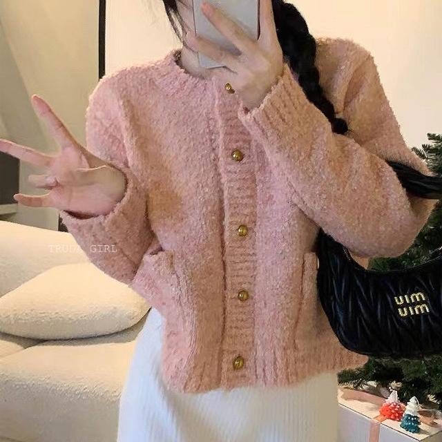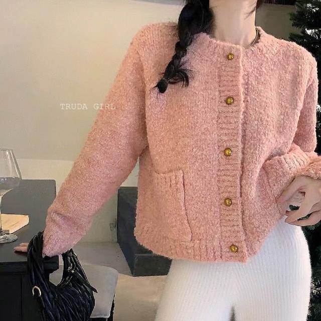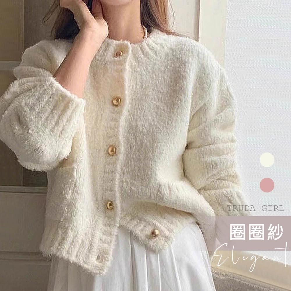 《杜達女孩》小香風圈圈紗金屬扣針織外套 法式復古軟糯毛絨針織外套 QQ毛衣外套 短版外套 名媛開衫上衣 長袖外套 針織