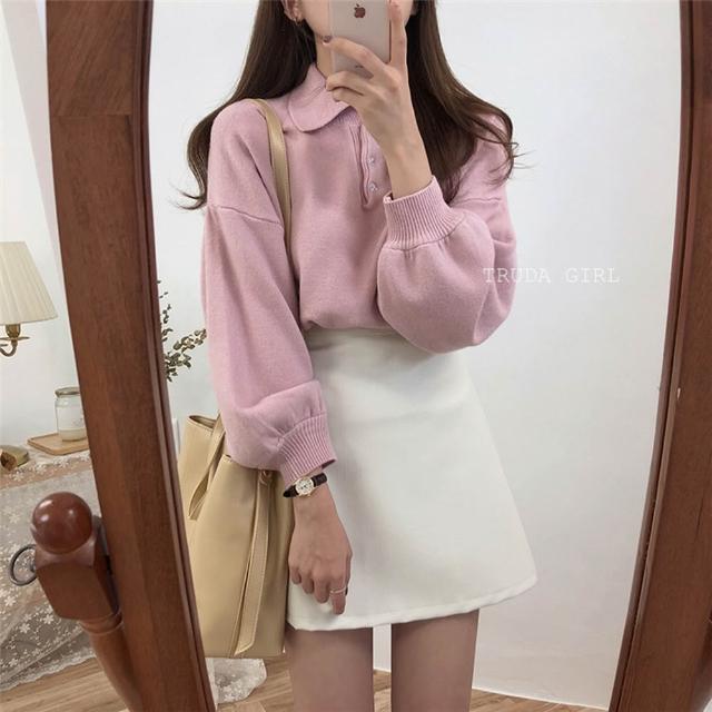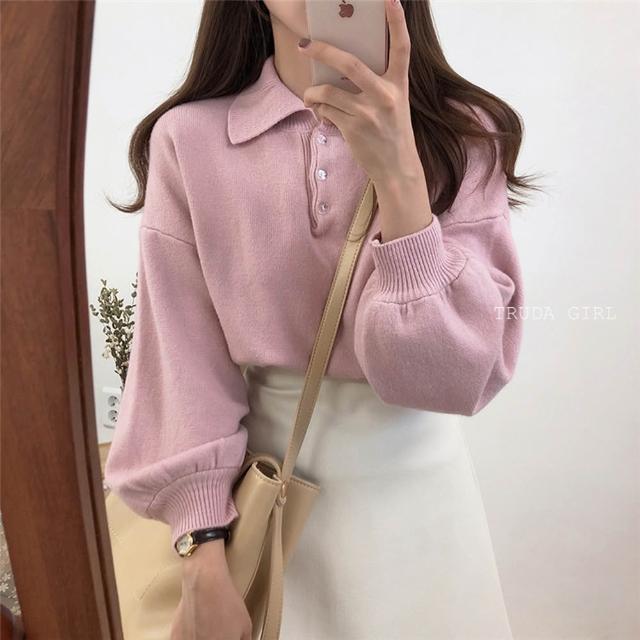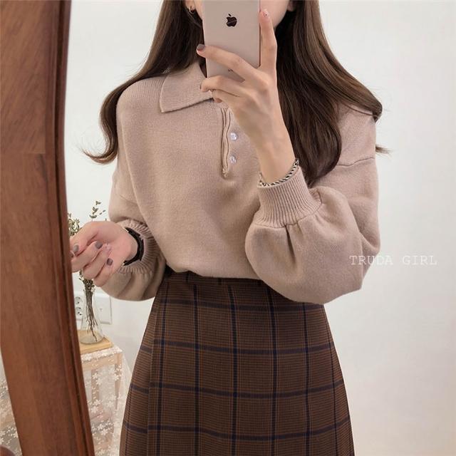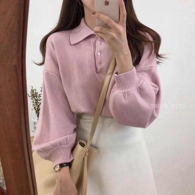 《杜達女孩》甜美翻領大泡泡袖針織上衣 長袖包心紗 針織毛衣 包芯紗 POLO領 縮口袖毛衣 翻領毛衣 長袖上衣