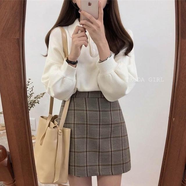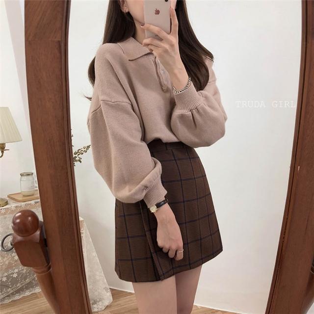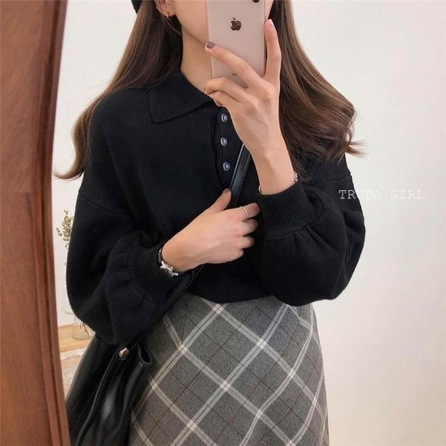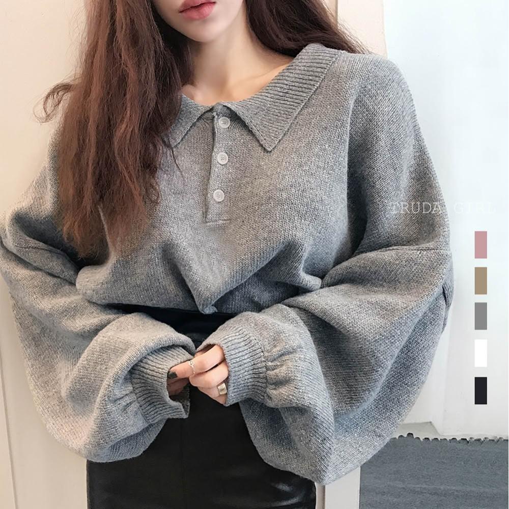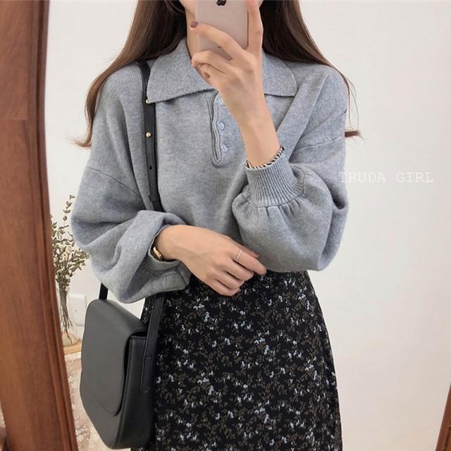 《杜達女孩》甜美翻領大泡泡袖針織上衣 長袖包心紗 針織毛衣 包芯紗 POLO領 縮口袖毛衣 翻領毛衣 長袖上衣