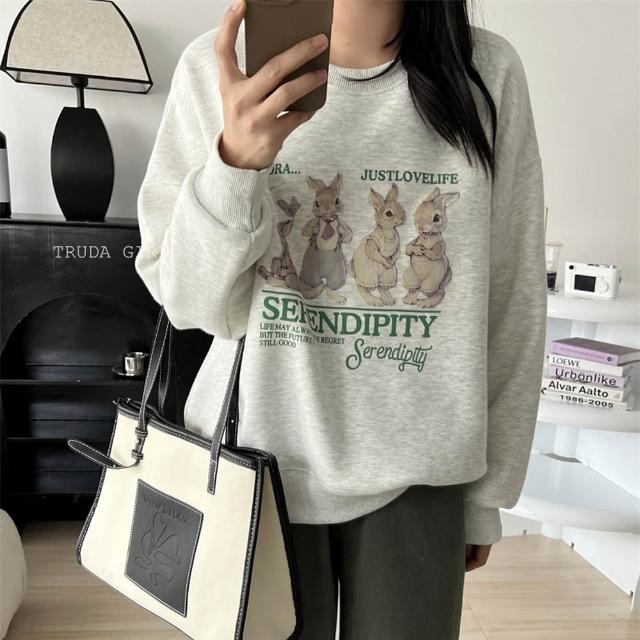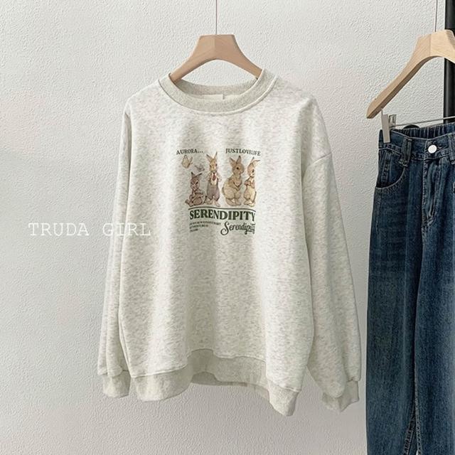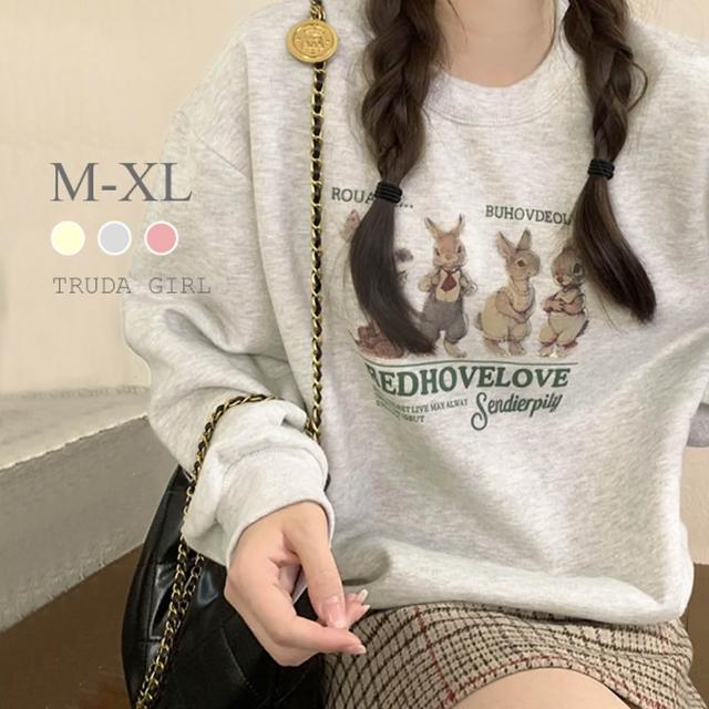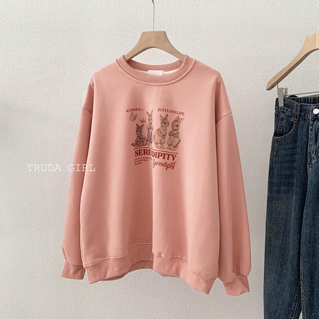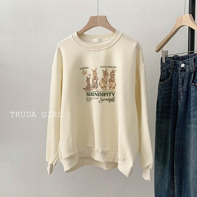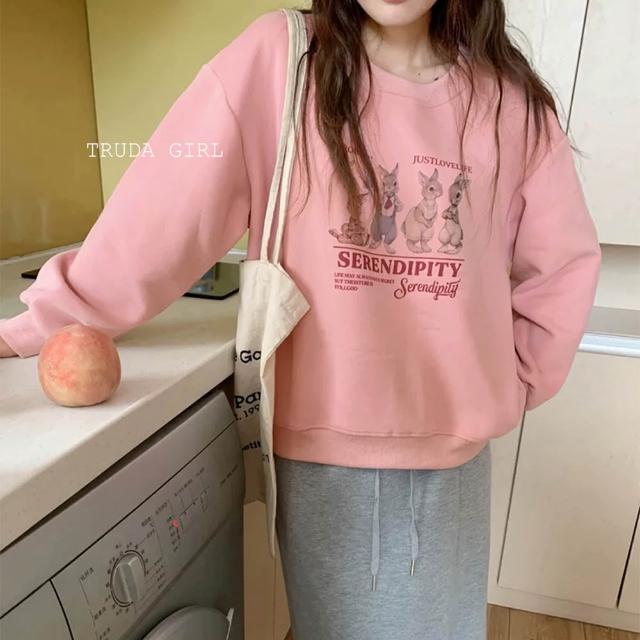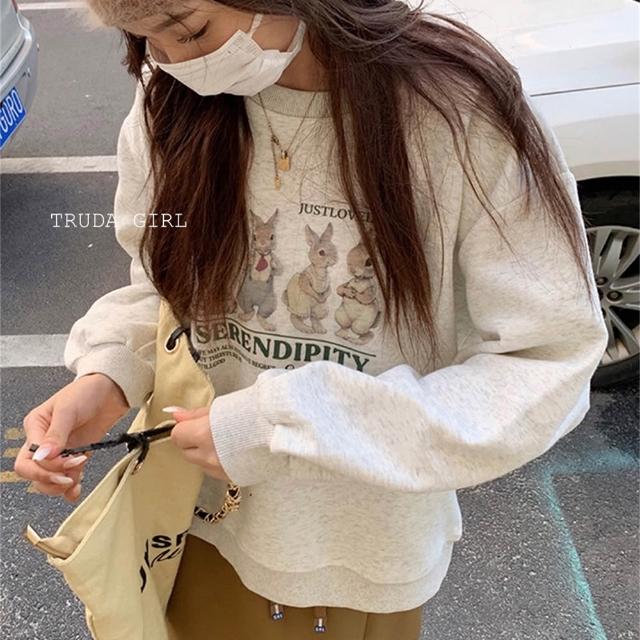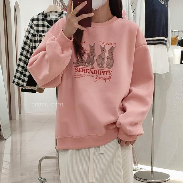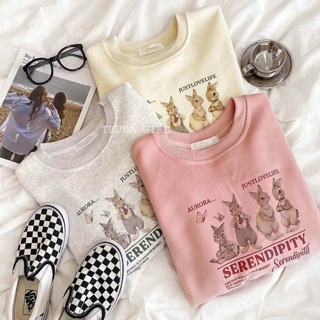 《杜達女孩》韓風兔兔家族🐰M-XL銀狐絨大學T 兔子上衣 長袖T恤 兔兔t 刷毛大學t 保暖加絨上衣