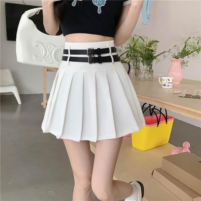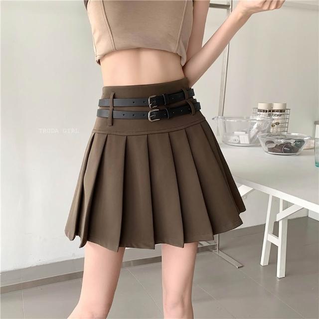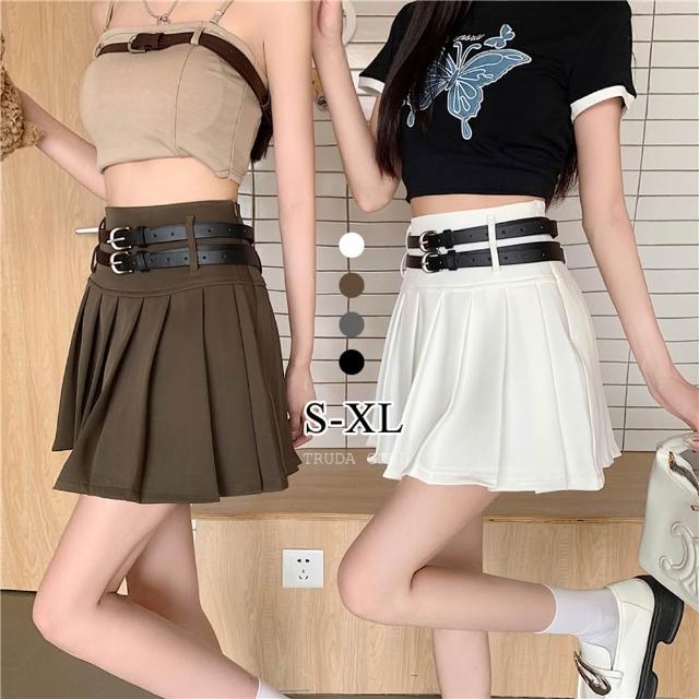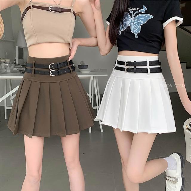 《杜達女孩》Y2K酷甜帥一次滿足 雙腰帶百褶短裙 防走光安全褲 高腰短裙 百褶裙 女 短裙 A字裙 西裝短裙 工裝裙