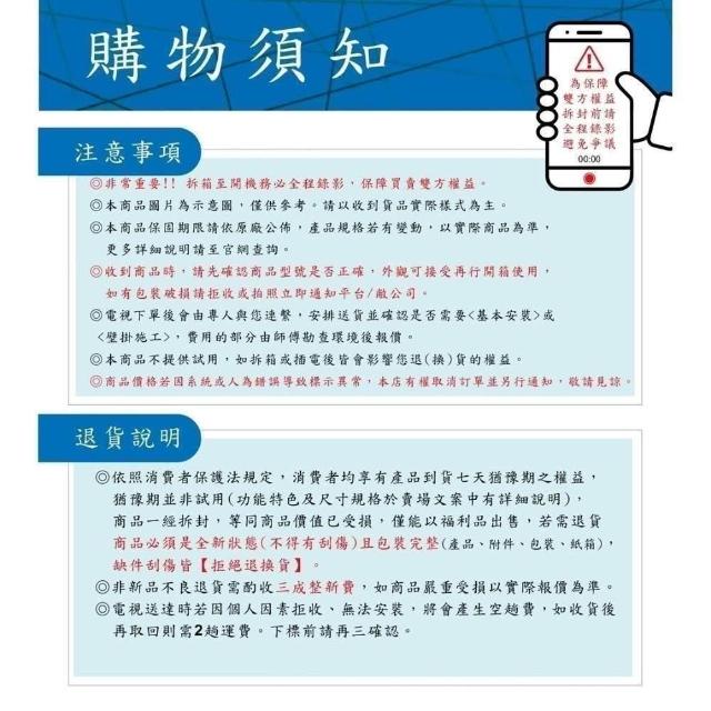 - 為保障您購物權益,開箱過程請全程錄影;如有問題請使用APP透過「問問」與商店聯繫,祝您購物愉快。
