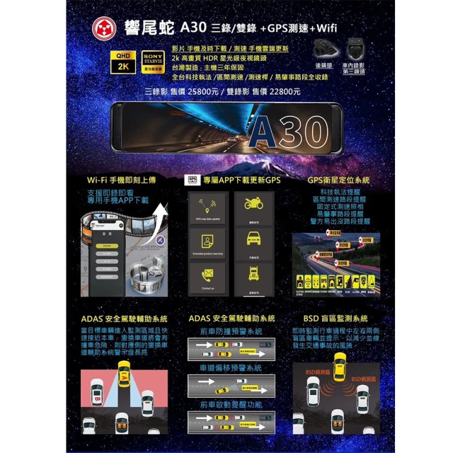 響尾蛇A302024新款高畫質行車紀錄器 前後雙錄 Sony 2K 畫質 BSD 盲區監測 ADAS GPS測速 WIFI 倒車顯影 贈32G記憶卡