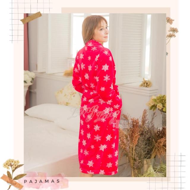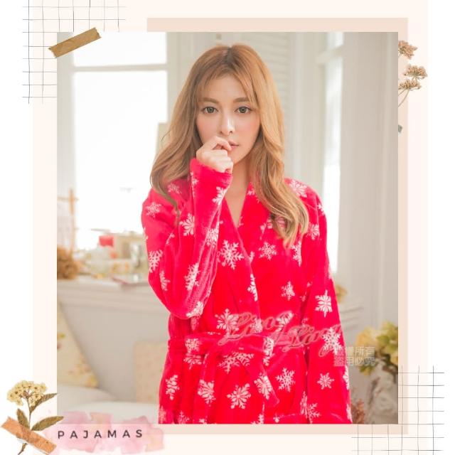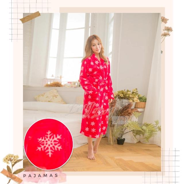 lingling全尺碼-雪花圖樣水貂絨綁帶保暖睡袍 居家服睡衣(PA3189-溫暖紅)