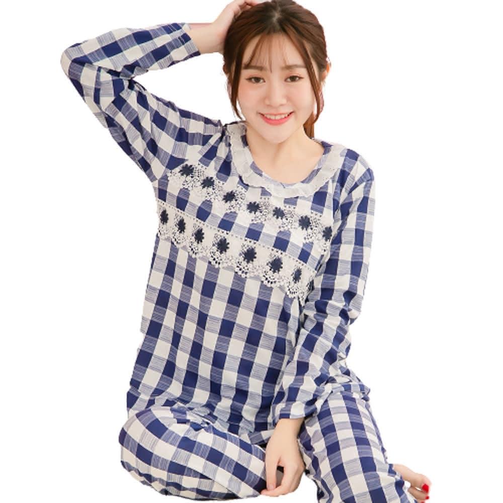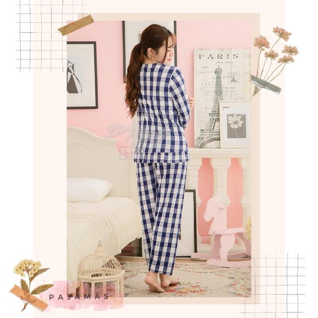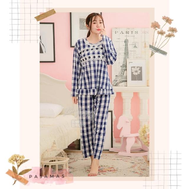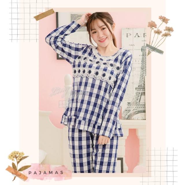 lingling全尺碼-格紋拼接布蕾絲棉質長袖二件式睡衣組 居家服成套睡衣(PA3897-藍白格)